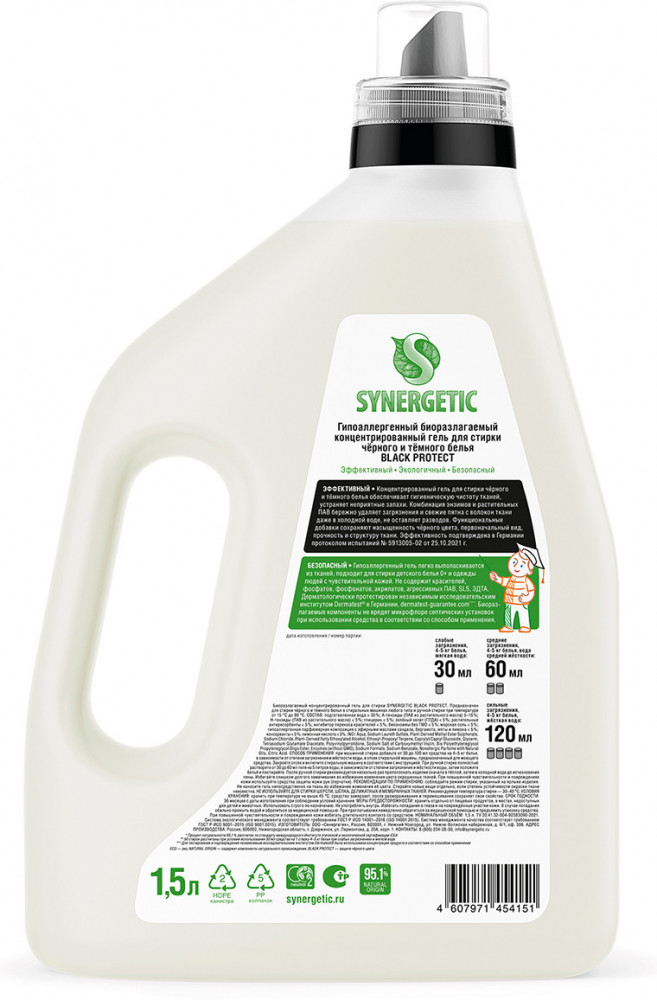 Биоразлагаемый концентрированный гель для стирки черного и темного белья Synergetic Black Protect обеспечивает бережное и эффективное очищение тканей, гигиеническую чистоту одежды и устраняет неприятные запахи. Средство можно использовать в стиральных машинах любого типа и при ручной стирке при температуре 15 — 90 °C. Комбинация энзимов и растительных ПАВ эффективно удаляет трудновыводимые и свежие пятна с волокон ткани даже в холодной жесткой воде и при коротких циклах стирки. Функциональные добавки сохраняют насыщенность и глубину черного цвета, первоначальный вид, прочность и структуру ткани. Активные компоненты препятствуют образованию катышков, делая волокна более гладкими. Гипоаллергенная отдушка на основе эфирных масел сандала, бергамота, мяты и лимона оставляет легкий и приятный аромат.Гель предназначен для стирки всех видов тканей, кроме деликатных и мембранных, а также шерсти и шелка. Биоразлагаемый гель полностью выполаскивается из тканей, не оставляет разводов, подходит для стирки детского белья 0+ и одежды людей с чувствительной кожей.