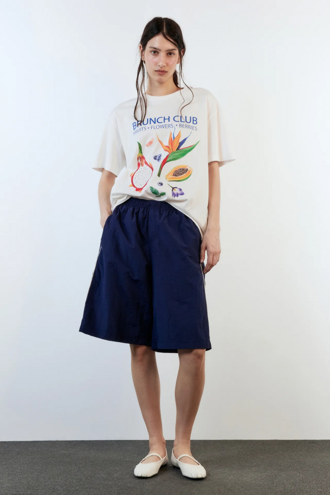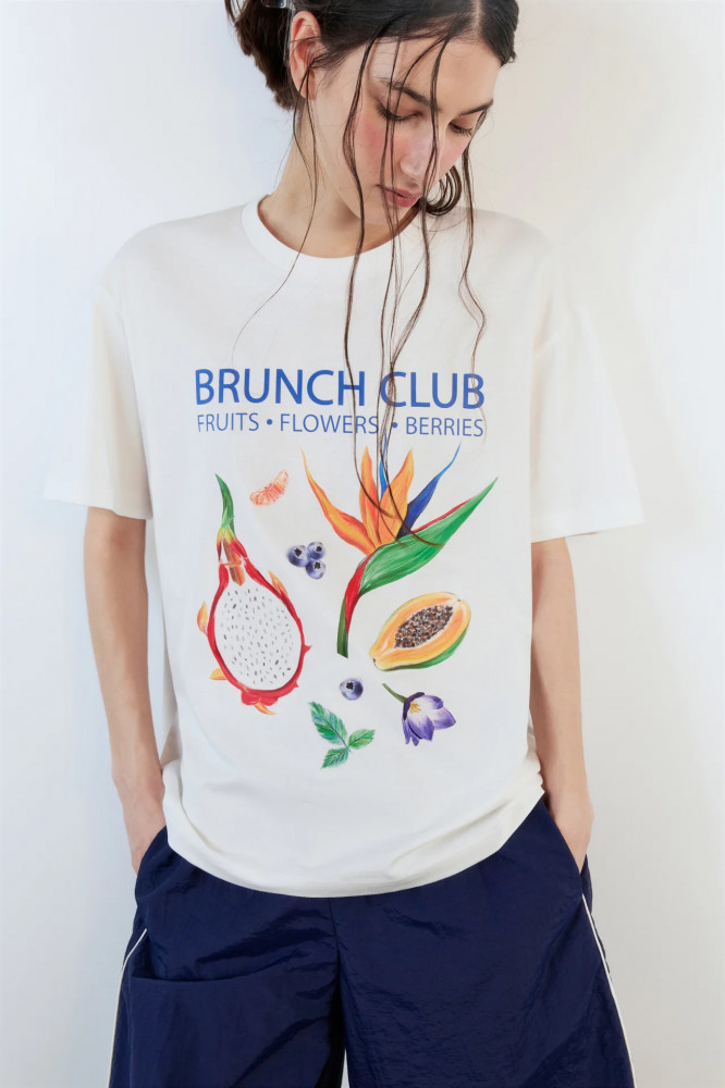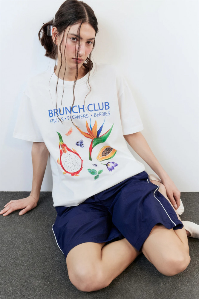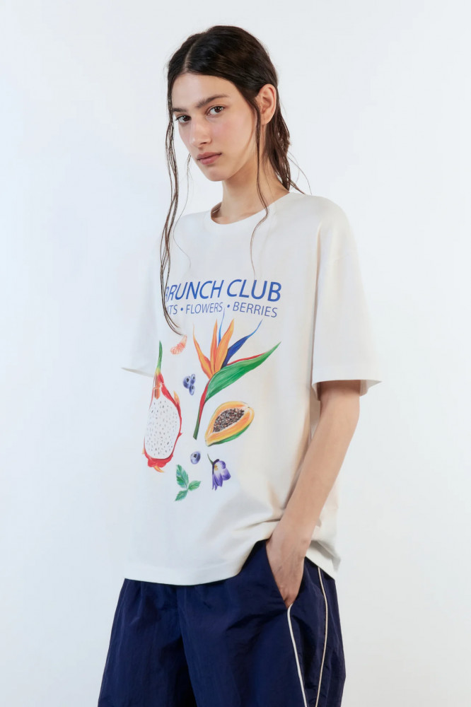 Основа основ любого гардероба: идеальная футболка из хлопка с принтом на любой случай жизни. универсальная и суперудобная хлопковая футболка с ярким фруктовым принтом под любое настроение подойдет для занятий спортом, йогой, повседневных луков и просто отдыха дома. Сочетай ее со спортивным, классическим или преппи-низом. Создай расслабленный образ с широкими штанами или более женственный с юбками и платьями. Обязательно попробуй удобное трендовое сочетание с бриджами. носи ее отдельно или используй в качестве основы для многослойных луков .