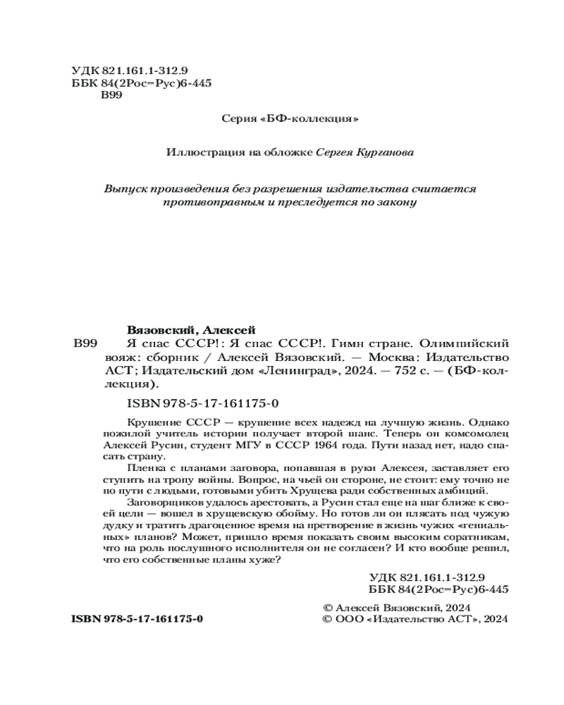 💳 Оплатить за товар можно при получении 🇰🇿 Есть бесплатная доставка по Казахстану от 1 дня 🎁 Копите бонусы с каждой покупки Серия: Коллекция Крушение СССР — крушение всех надежд на лучшую жизнь. Однако пожилой учитель истории получает второй шанс. Теперь он комсомолец Алексей Русин, студент МГУ в СССР 1964 года. Пути назад нет, надо спасать страну. Пленка с планами заговора, попавшая в руки Алексея, заставляет его ступить на тропу войны. Вопрос, на чьей он стороне, не стоит: ему точно не по пути с людьми, готовыми убить Хрущева ради собственных амбиций. Заговорщиков удалось арестовать, а Русин стал еще на шаг ближе к своей цели — вошел в хрущевскую обойму. Но готов ли он плясать под чужую дудку и тратить драгоценное время на претворение в жизнь чужих «гениальных» планов? Может, пришло время показать своим высоким соратникам, что на роль послушного исполнителя он не согласен? И кто вообще решил, что его собственные планы хуже? |