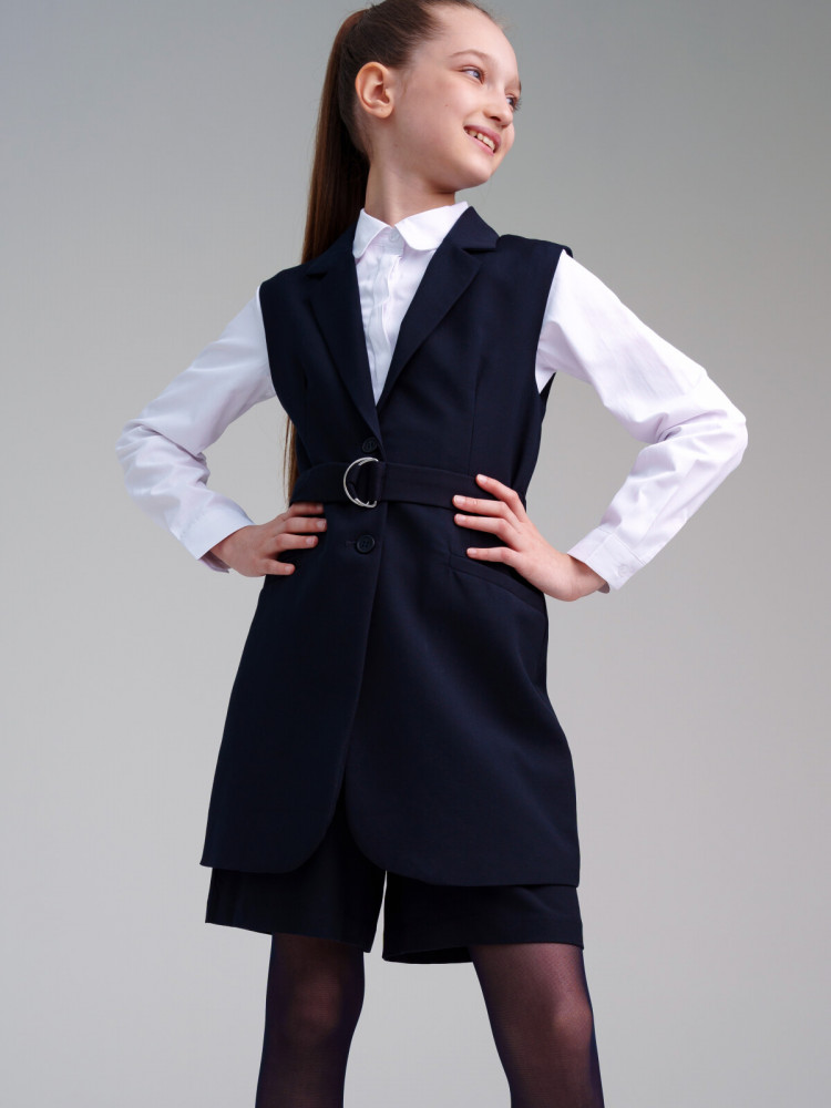 Школьный синий костюм — это главный деловой атрибут любой школьницы. Комплект для девочки подростка отлично подойдет в школу на каждый день и для торжественных мероприятий. Сложный состав ткани позволяет носить жилет продолжительное время в течение дня, ощущая уют и комфорт. Удлиненный жилет на подкладке с застежкой на пуговицы и поясом по талии. Удобные боковые карманы. Школьные шорты на резинке обеспечивают комфортную посадку по фигуре. Удобные карманы в боковых швах.