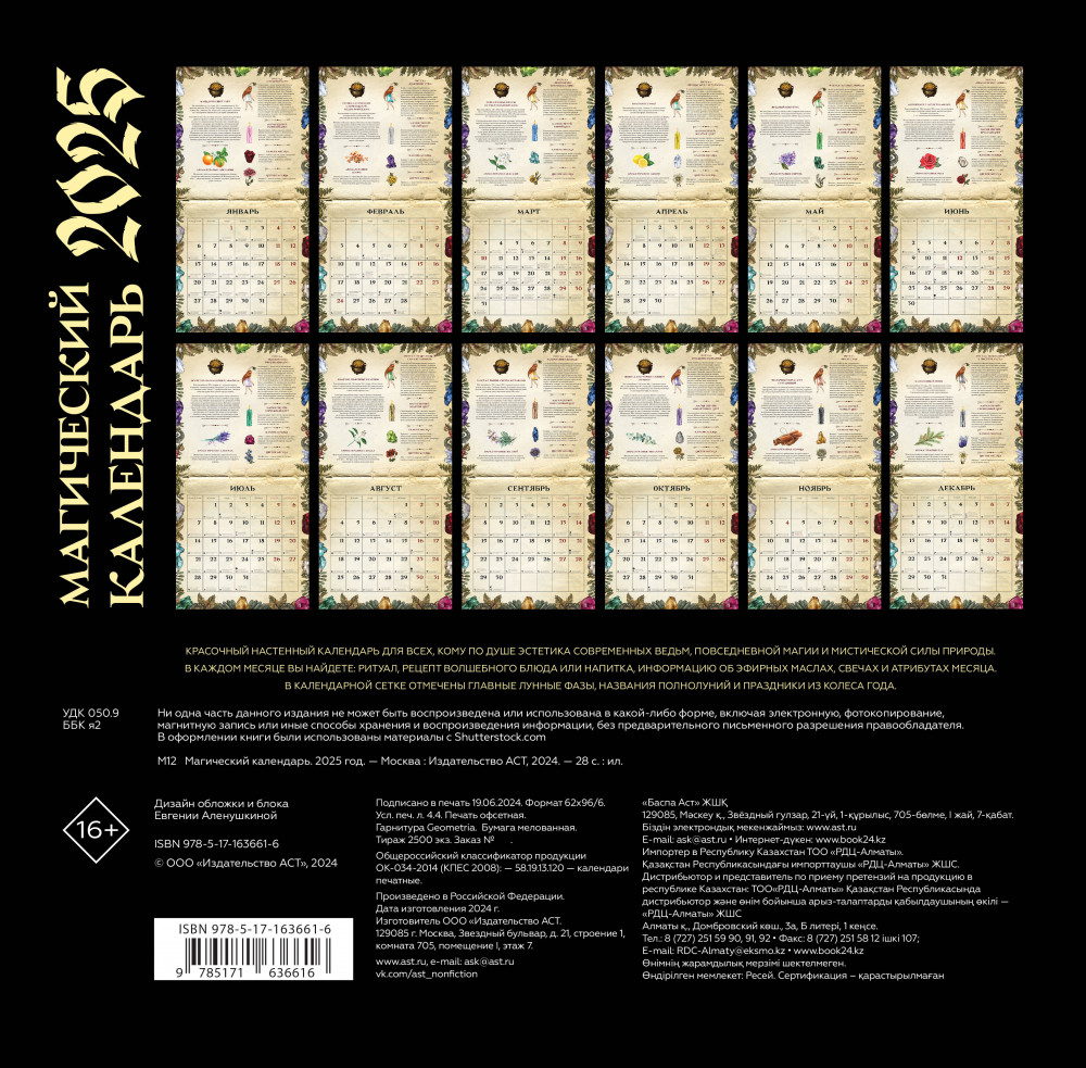 Календарь настенный на 2025 год «Магический»В данный момент этот товар отсутствует в продаже. Возможно, у нас найдется аналогичный или похожий товар здесь. Серия: Календарь настенный на 2025 год Красочный настенный календарь для всех, кому по душе эстетика современных ведьм, повседневной магии и мистической силы природы. В каждом месяце вы найдете: ритуал, рецепт волшебного блюда или напитка, информацию об эфирных маслах, свечах и атрибутах месяца. В календарной сетке отмечены главные лунные фазы, названия полнолуний и праздники из Колеса года. |