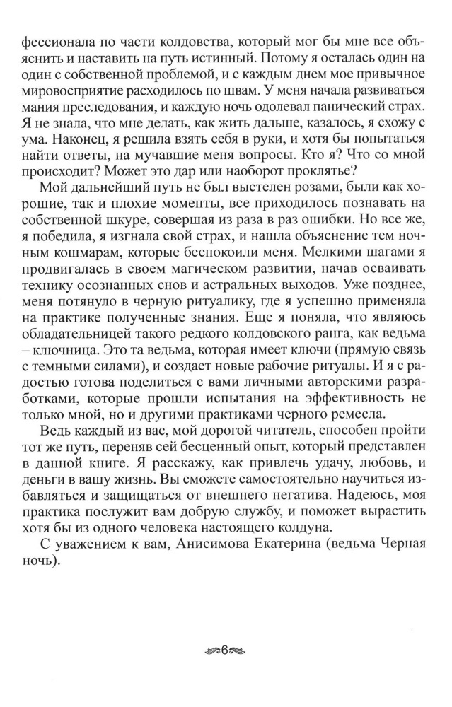 Книга Ведьмы: Введение в практическую черную магиюЕкатерина Сергеевна Анисимова (Ведьма Черная ночь) В данный момент этот товар отсутствует в продаже. Возможно, у нас найдется аналогичный или похожий товар здесь. Эта книга освещает вопросы практической черной магии в традициях русского чернокнижия. Ее автор, сибирская ведьма — таролог, делиться своими секретами и накопившимся опытом с искушенным читателем. С помощью книги, вы с легкостью сможете овладеть основами колдовского мастерства, освоить работу с мантическими предсказательными системами, а так же развить свое экстрасенсорное восприятие и энергетику. Надеемся, она будет полезна не только начинающему практику, но и уже состоявшемуся магу, поскольку содержит в себе уникальные авторские методики и новые рабочие ритуалы. |