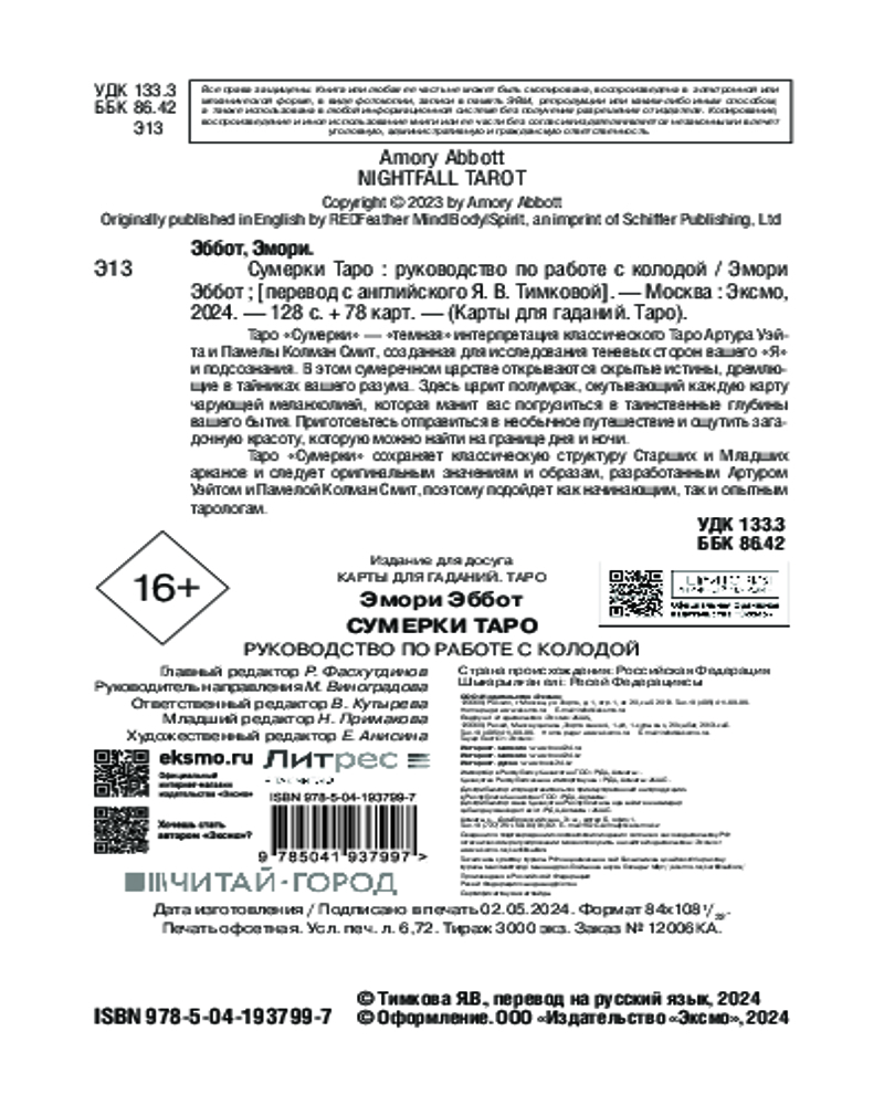 💳 Оплатить за товар можно при получении 🇰🇿 Есть бесплатная доставка по Казахстану от 1 дня 🎁 Копите бонусы с каждой покупки Серия: Карты для гаданий. Таро В Таро «Сумерки» Эмори Эббота царит полумрак, окутывающий каждую карту чарующей меланхолией. Эта колода была создана для исследования теневых сторон вашего «Я» и глубин подсознания. Здесь открываются скрытые истины, дремлющие в тайниках вашего разума. Приготовьтесь отправиться в необычное путешествие и ощутить загадочную красоту, которую можно найти на границе дня и ночи. |