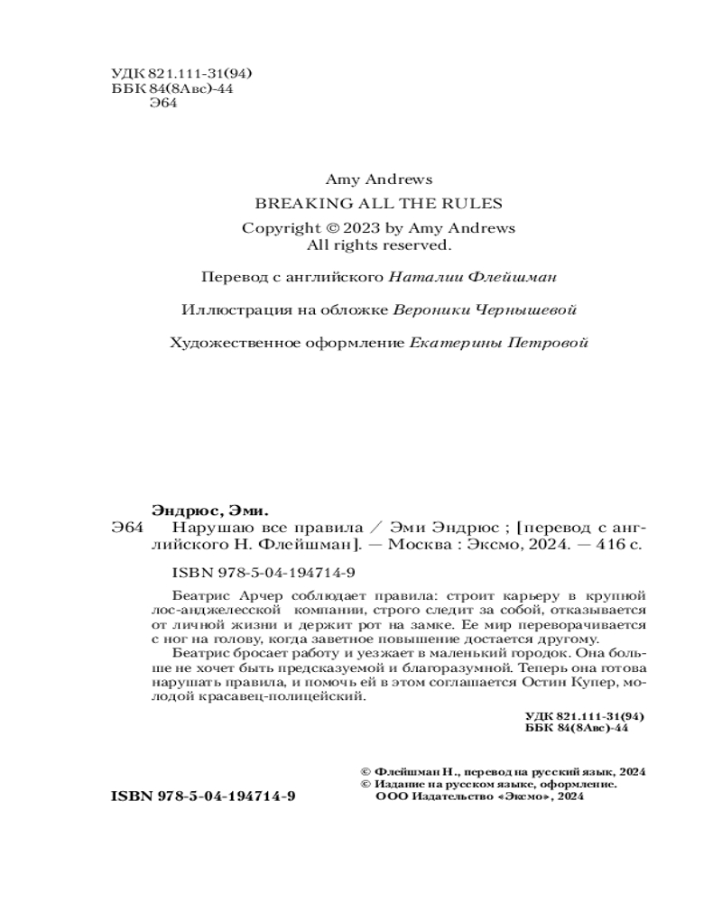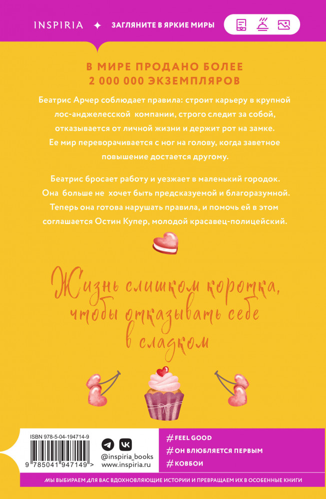 💳 Оплатить за товар можно при получении 🇰🇿 Есть бесплатная доставка по Казахстану от 1 дня 🎁 Копите бонусы с каждой покупки Серия: Cupcake. Миллион ярких свиданий Беатрис Арчер соблюдает правила: строит карьеру в крупной лос-анджелесской компании, строго следит за собой, отказывается от личной жизни и держит рот на замке. Ее мир переворачивается с ног на голову, когда заветное повышение достается другому. Беатрис бросает работу и уезжает в маленький городок. Она больше не хочет быть предсказуемой и благоразумной. Теперь она готова нарушать правила, и помочь ей в этом соглашается Остин Купер, молодой красавец-полицейский. |