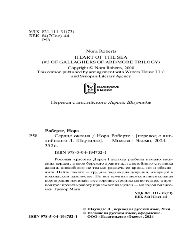 💳 Оплатить за товар можно при получении 🇰🇿 Есть бесплатная доставка по Казахстану от 1 дня 🎁 Копите бонусы с каждой покупки Серия: Нора Робертс. Мега-звезда современной прозы. Новое оформление Роковая красотка Дарси Галлахер разбила немало мужских сердец, а свое бережно хранит для достойного спутника жизни, способного не только разжечь ее кровь, но и обеспечить. Найти такого — трудная задача для девушки, живущей в ирландском захолустье. Но вот крупная межконтинентальная корпорация начинает в ее городке строительство театра, а проконтролировать работу приезжает владелец — молодой бизнесмен Тревор Маги. |