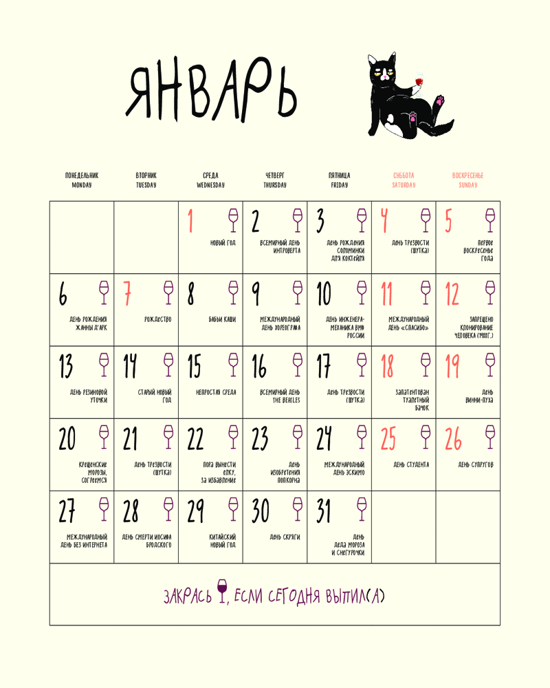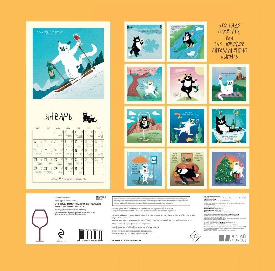 Календарь настенный на 2025 год «Это надо отметить. Или 365 поводов интеллигентно выпить»юмор качество печати подарок В данный момент этот товар отсутствует в продаже. Возможно, у нас найдется аналогичный или похожий товар здесь. Серия: Календари настенные 2025 (300×300) Календарь для любителей винишка и котиков. На каждом развороте — шутка про вино и стильный рисунок смешного кота с покер-фейсом. В сетке каждый день — символ бокала, чтобы помечать дни, когда пил, и повод выпить: первая пятница года, день бармена, начало Октоберфеста и т. д. |