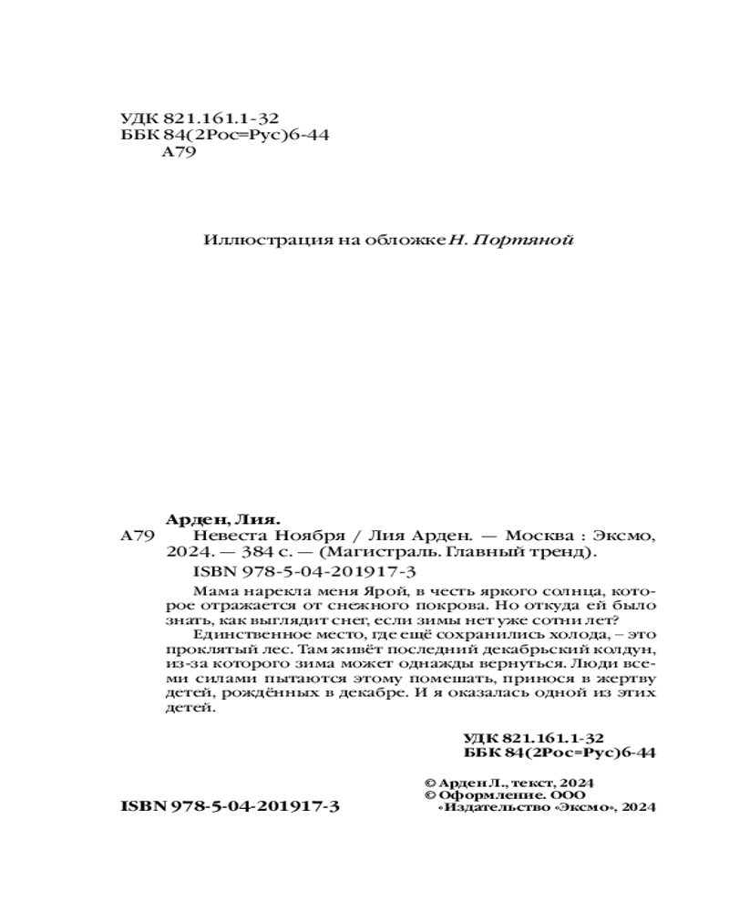 💳 Оплатить за товар можно при получении 🇰🇿 Есть бесплатная доставка по Казахстану от 1 дня 🎁 Копите бонусы с каждой покупки Серия: Магистраль. Главный тренд Мама нарекла меня Ярой, в честь яркого солнца, которое отражается от снежного покрова. Но откуда ей было знать, как выглядит снег, если зимы нет уже сотни лет? Единственное место, где ещё сохранились холода, — это проклятый лес. Там живёт последний декабрьский колдун, из-за которого зима может однажды вернуться. Люди всеми силами пытаются этому помешать, принося в жертву детей, рождённых в декабре. И я оказалась одной из этих детей. |