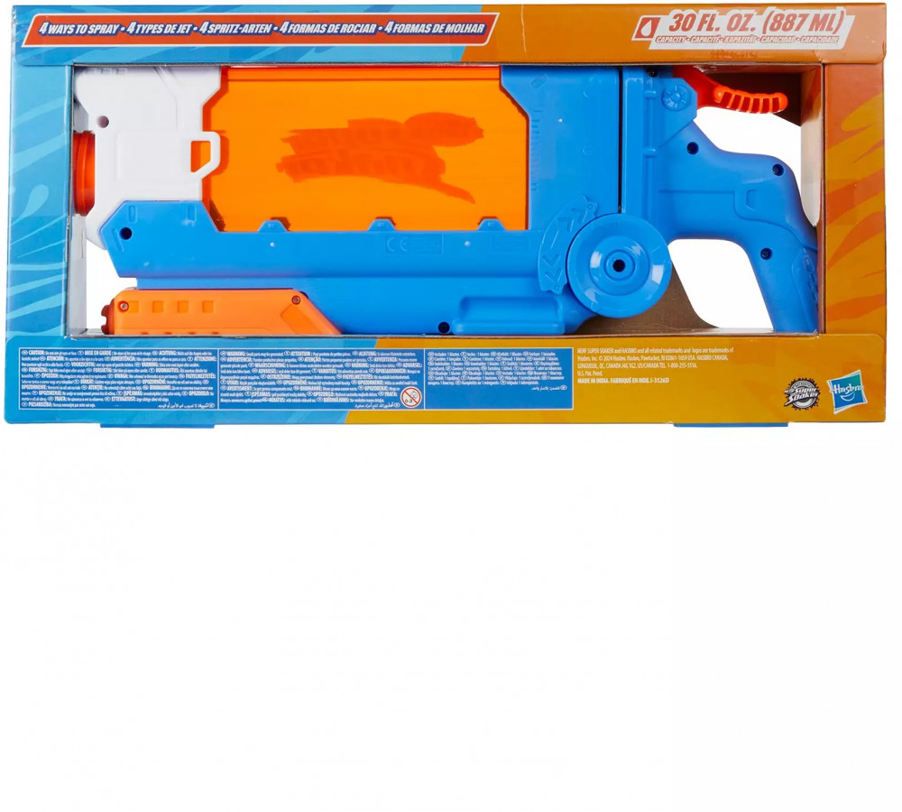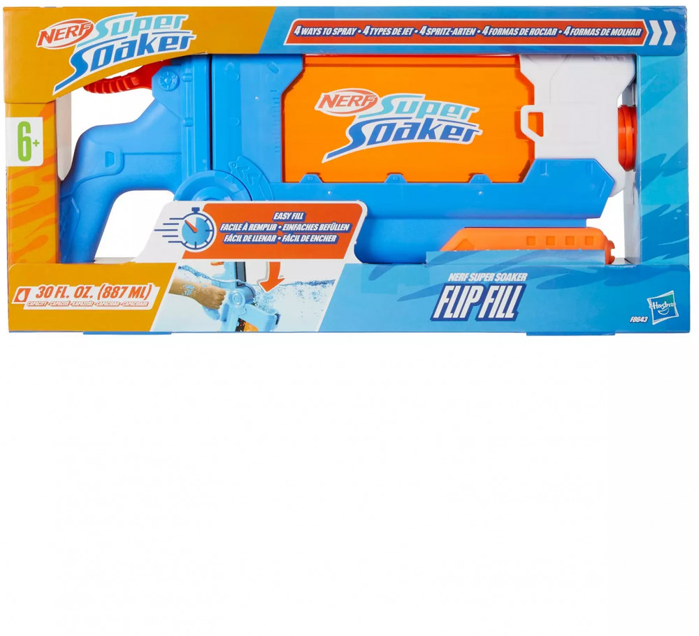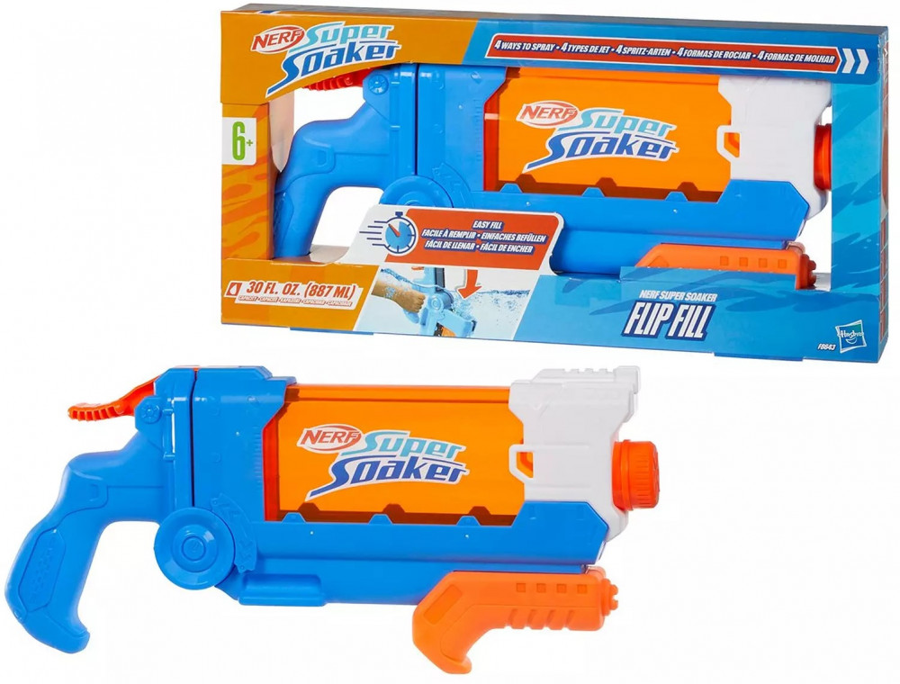 Водоструйный аппарат Nerf Super Soaker с переворачивающейся заливкой имеет 4 различных стиля струи воды, поэтому вы можете выбрать способ, которым вы будете погружать друзей и семью в водное веселье на заднем дворе. Просто поверните насадку на бластере, чтобы выпустить узкую одиночную струю, покройте их разбрызгивающим потоком или полейте впитавшуюся воду из наклонной веерной струи. Бластер имеет конструкцию с быстрой заправкой, поэтому вы сразу же готовы к играм на свежем воздухе. Бак вмещает до 887 миллилитров воды.