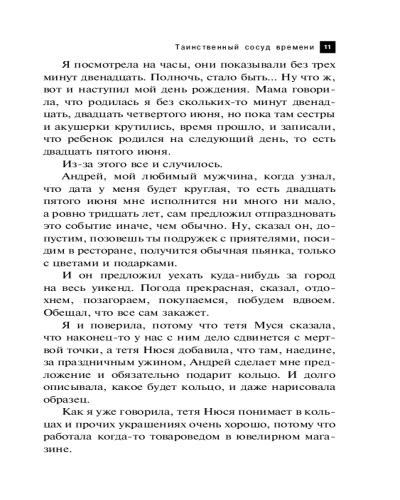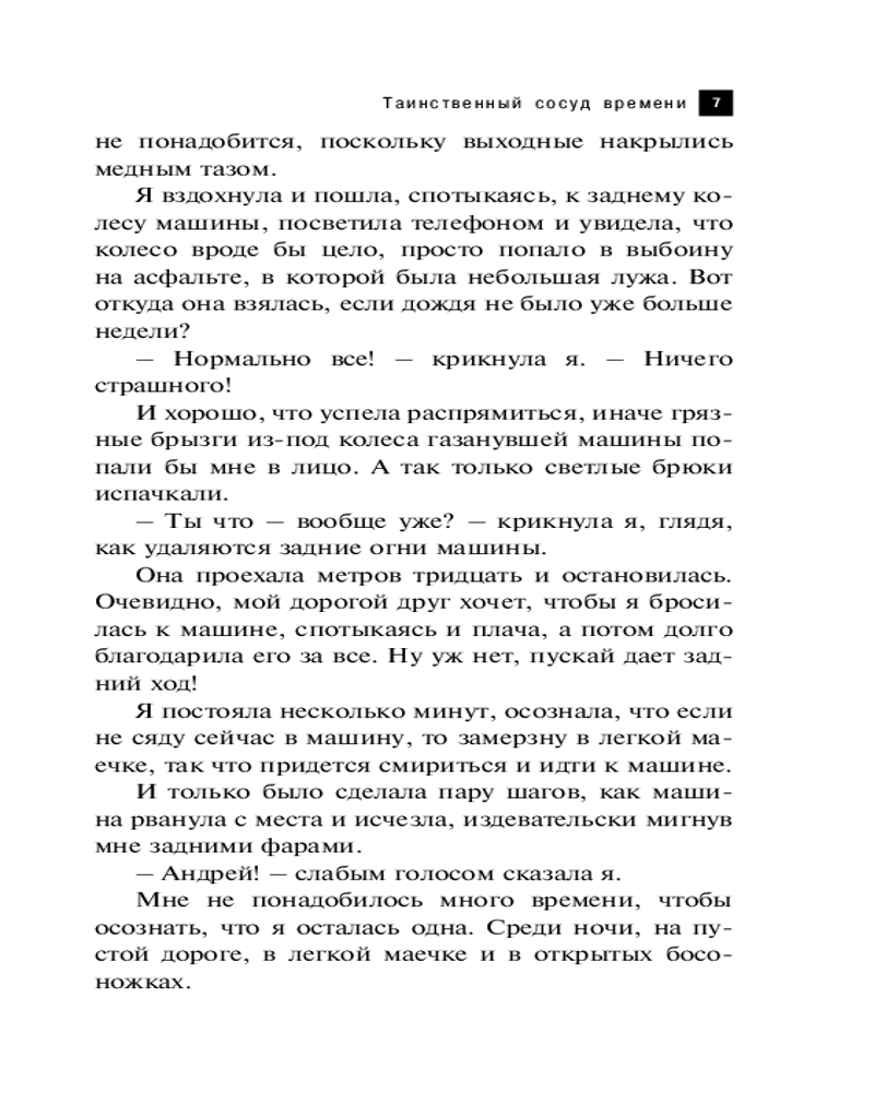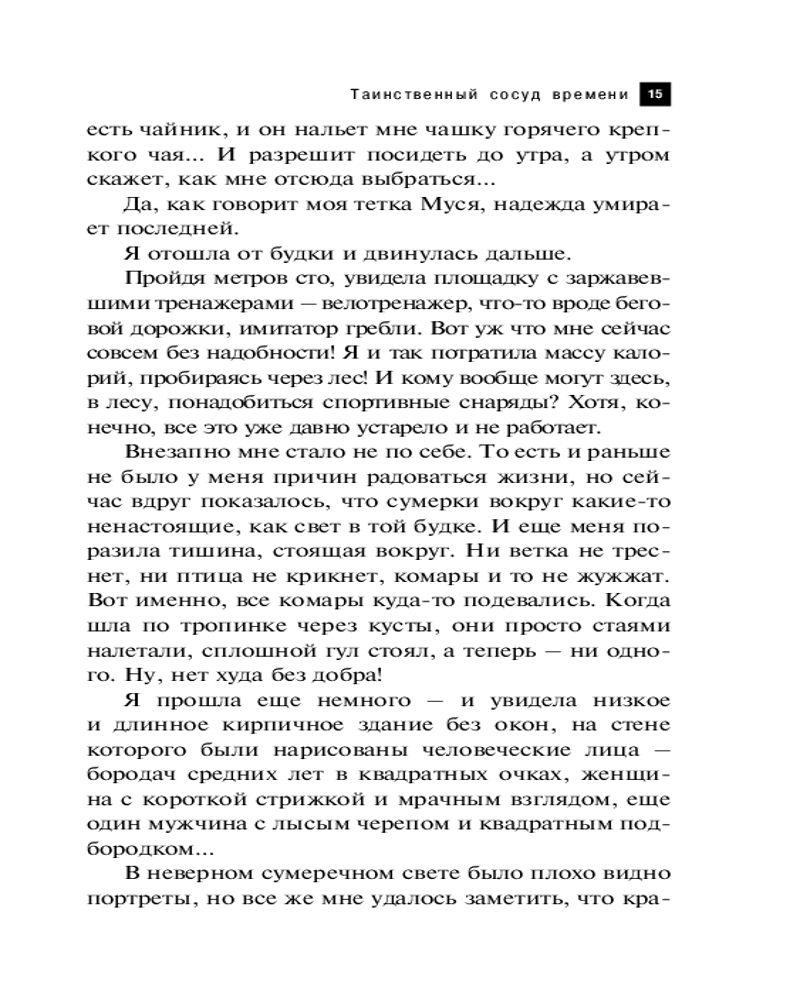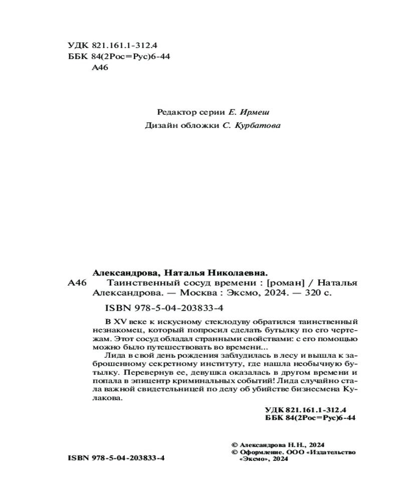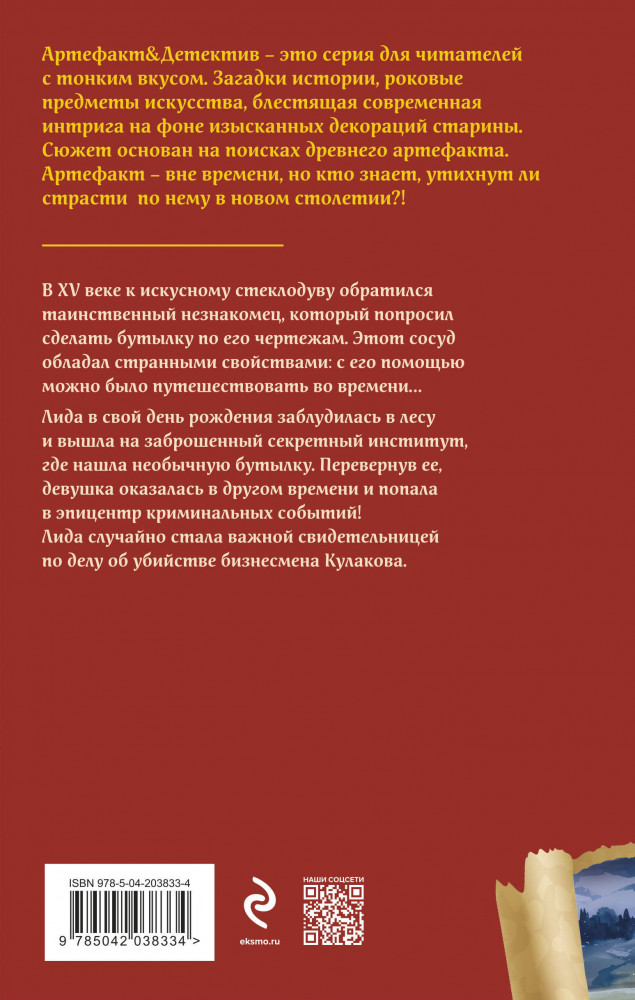 Таинственный сосуд времениНаталья Николаевна Александрова В данный момент этот товар отсутствует в продаже. Возможно, у нас найдется аналогичный или похожий товар здесь. Серия: Артефакт & Детектив (Новое оформление) В XV веке к искусному стеклодуву обратился таинственный незнакомец, который попросил сделать бутылку по его чертежам. Этот сосуд обладал странными свойствами, с его помощью можно было путешествовать во времени... Лида в свой день рождения заблудилась в лесу и вышла на заброшенный секретный институт, где нашла необычную бутылку. Перевернув ее, девушка оказалась в другом времени и попала в эпицентр криминальных событий! Лида случайно стала важной свидетельницей по делу об убийстве бизнесмена Кулакова. |