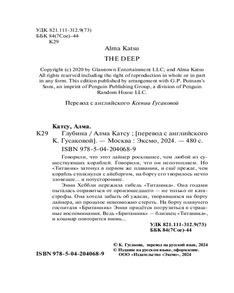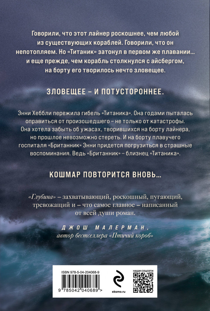 💳 Оплатить за товар можно при получении 🇰🇿 Есть бесплатная доставка по Казахстану от 1 дня 🎁 Копите бонусы с каждой покупки Серия: Дом монстров (обложка) Говорили, что этот лайнер роскошнее, чем любой из существующих кораблей. Говорили, что он непотопляем. Но «Титаник» затонул в первом же плавании, и ещё прежде, чем корабль столкнулся с айсбергом, на борту его творилось нечто зловещее... и потустороннее. Энни Хеббли пережила гибель «Титаника». Она годами пыталась оправиться от произошедшего — не только от катастрофы. Она хотела забыть об ужасах, творившихся на борту лайнера, но прошлое невозможно стереть. На борту плавучего госпиталя «Британник» Энни придётся погрузиться в страшные воспоминания. Ведь «Британник» — близнец «Титаника», и кошмар повторится вновь... |