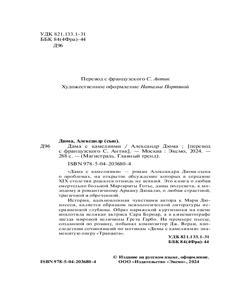 💳 Оплатить за товар можно при получении 🇰🇿 Есть бесплатная доставка по Казахстану от 1 дня 🎁 Копите бонусы с каждой покупки Серия: Магистраль. Главный тренд «Дама с камелиями» — роман Александра Дюма-сына о проблемах, на открытое обсуждение которых в середине XIX столетия решался отнюдь не всякий. Это книга о любви смертельно больной Маргариты Готье, дамы полусвета, к молодому и романтичному Арману Дювалю, о любви страстной, трагичной и обреченной. История, вдохновленная чувствами автора к Мари Дюплесси, является образцом психологической литературы несравненной глубины. Образ парижской куртизанки на сцене воплотила великая актриса Сара Бернар, а в кинематографе звезда мировой величины Грета Гарбо. На премьере пьесы, созданной по роману, побывал композитор Дж. Верди, впоследствии сочинивший по мотивам «Дамы с камелиями» знаменитую оперу «Травиата». |