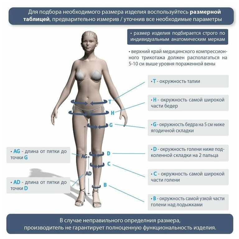 Для подбора необходимого размера изделия воспользуйтесь размерной таблицей, предварительно измерив / уточнив все необходимые параметры. Размер изделия подбирается строго по индивидуальным анатомическим меркам. Верхний край медицинского компрессионного трикотажа должен располагаться на 5-10 см выше уровня пораженной вены. В случае неправильного определения размера, производитель не гарантирует полноценную функциональность изделия.
