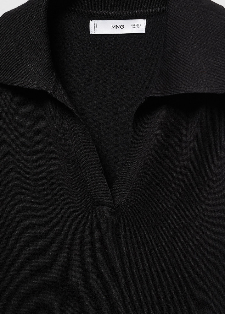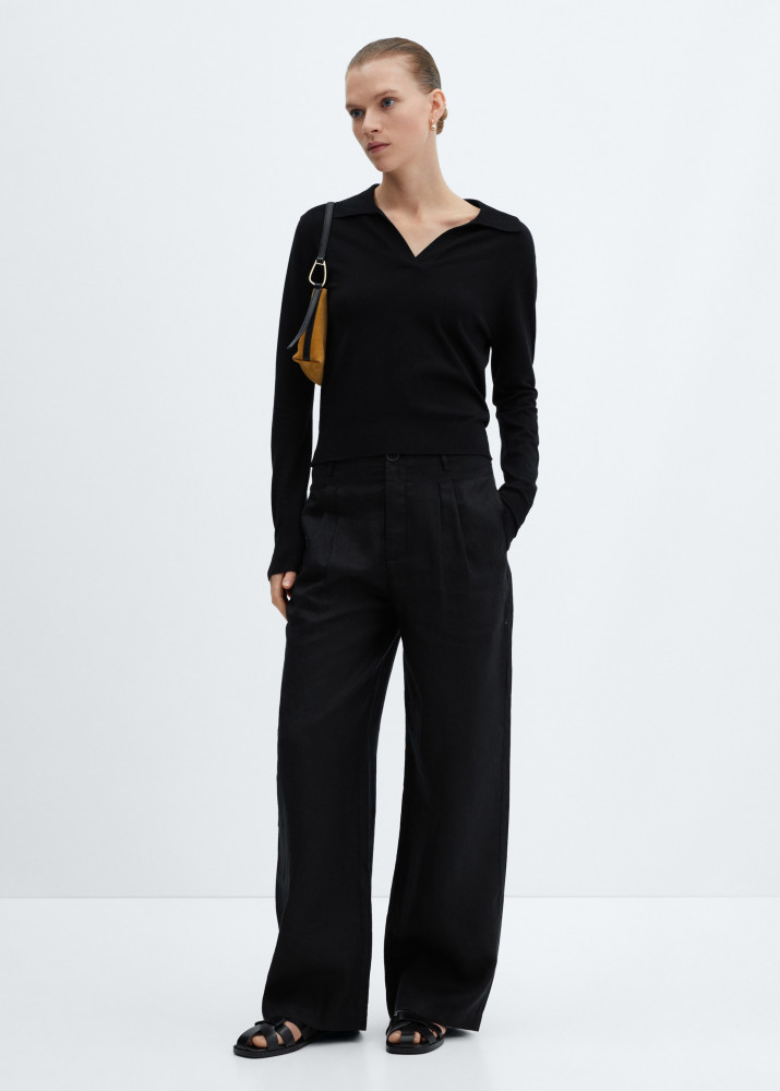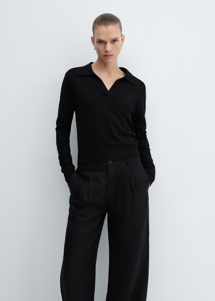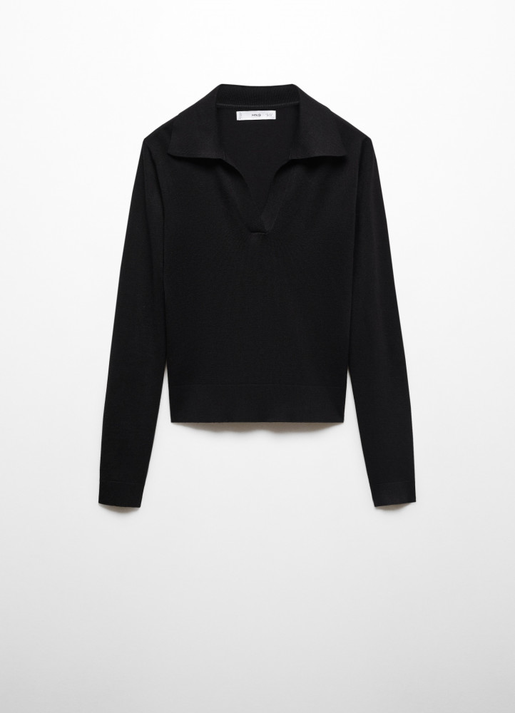 Вязаный джемпер с воротником поло. Тонкий трикотаж. Прямой фасон. Воротник-поло. Длинные рукава. Без застежки. Образы для офиса.
