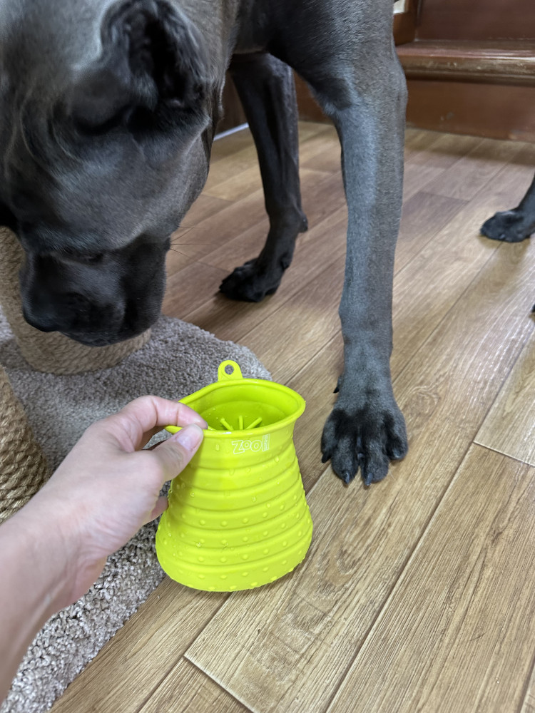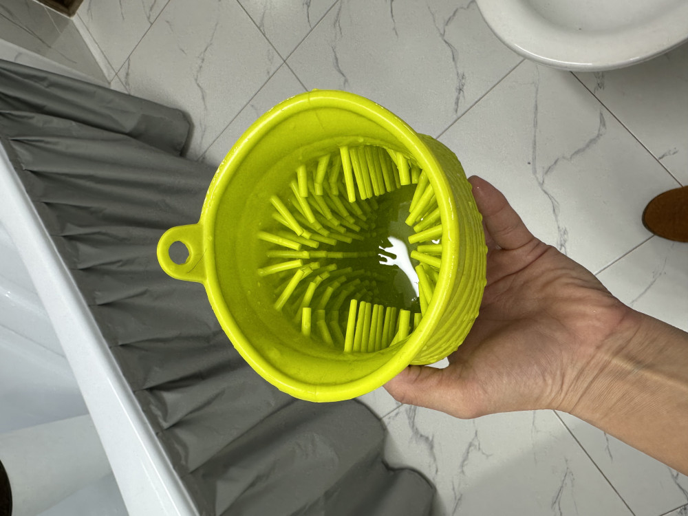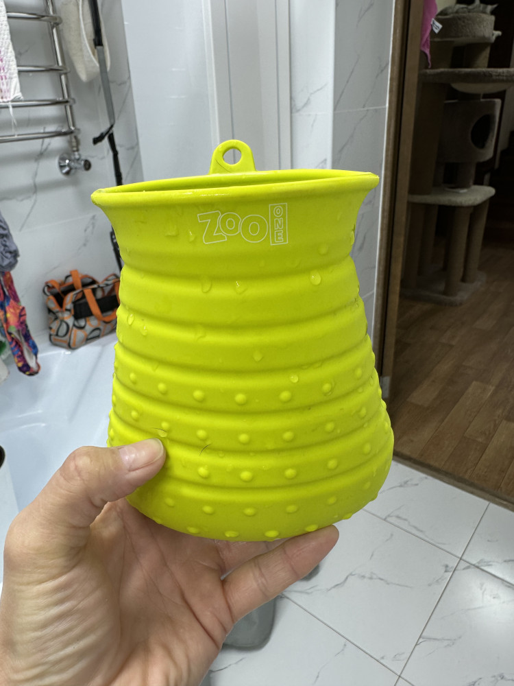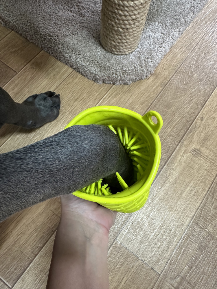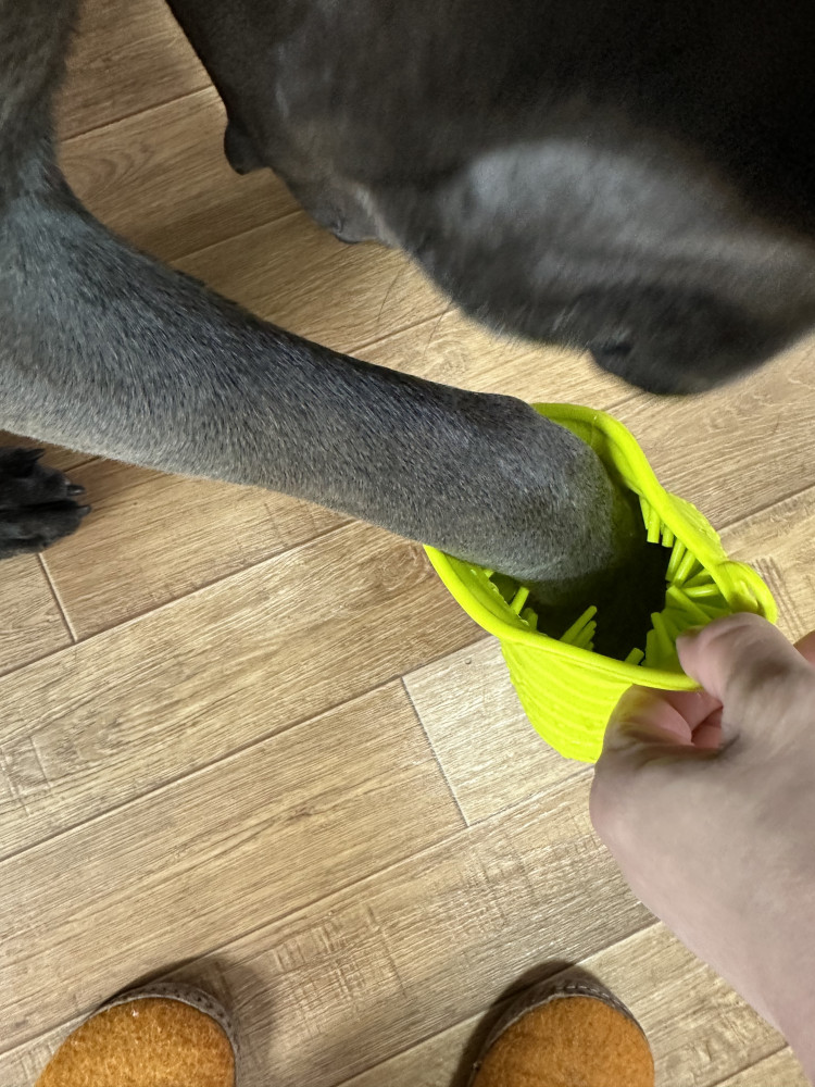 Отличная лапамойка! Главное его преимущество в том, что силикон давольно плотной и в то же время держа ее с наружи, очень легко мыть лапы, зажимая и крутя как хочешь! До этого была лапамойка фирмы «Мультидом Трейдинг», но со временем она стала мала! Объем старой лапломойки был 600 мл, да и моей Кане Корсо было 6 месяцев, когда мы начали ее использовать! Сейчас нам 1 год и лапу уже запихивала, при этом щетинки ломались. В итоге, пришлось выкинуть, щетинок вообще не осталось🤣 В целом, старая нам тоже очень нравилась, она была у нас первой! 👍 Я от нее была в восторге 🥰 Сейчас скажу, что все таки для крупных пород собак нужна именно лапомойка из мягкого силикона, чтобы можно было не просто в круговую мыть, а ещё и под ногтями почистить! И именно данная модель удовлетворяет все наши требования! Данная модель именно для крупных пород собак! Воду надо заполнить только до второго деления и уже при опускании лап в емкость, воды станет достаточно, чтобы лапа вся промылась и жамкать можно лапу☺️ На фото показана моя Кане Корсо, ей год, говорят будет ещё расти, надеюсь, не на много! Но эта модель очень объемная, и мне кажется, из нее мы уже точно не вырастим!!! Товар рекомендую - удобная вещь!!!🙏🔥