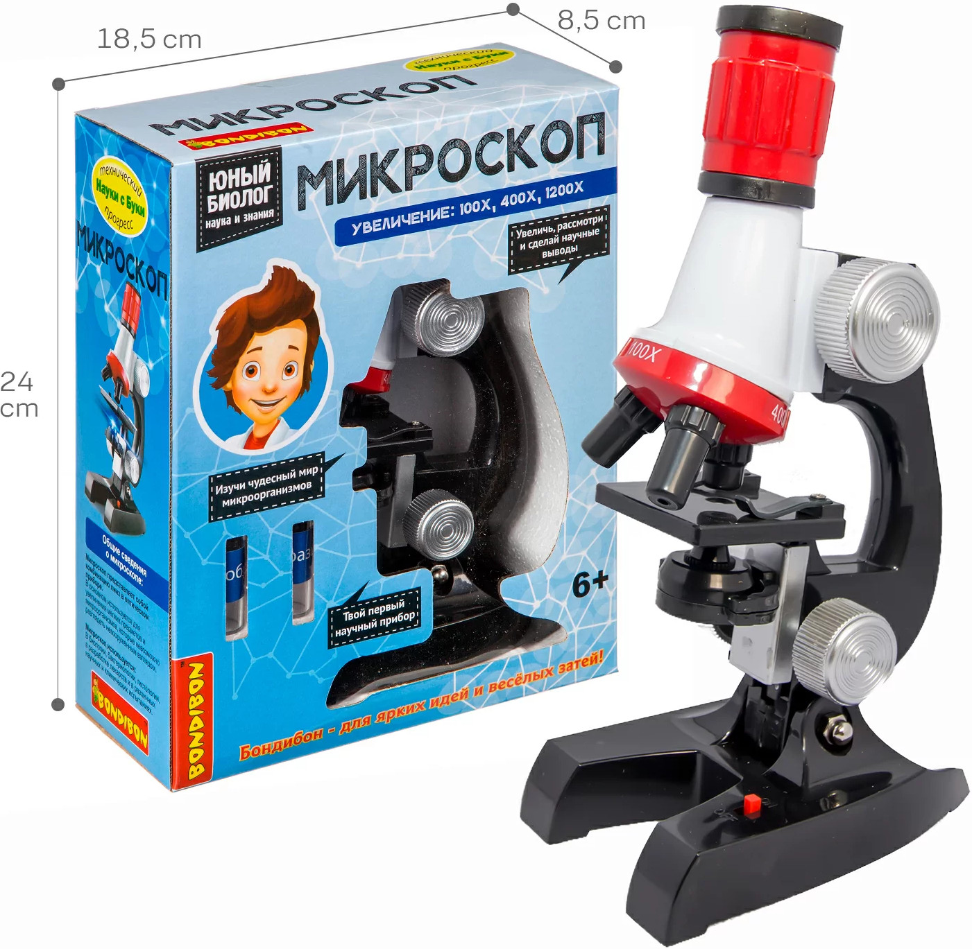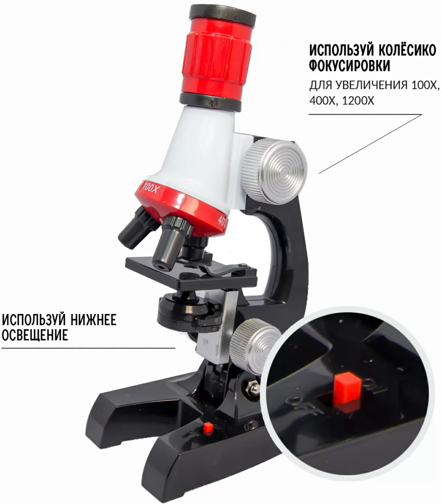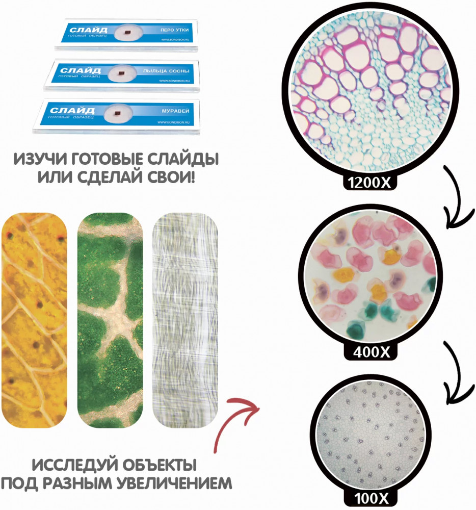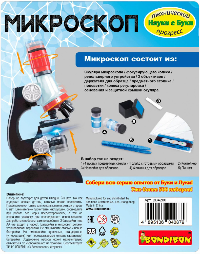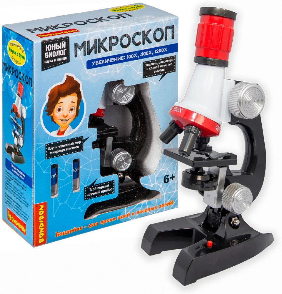 Изучай объекты, которые невозможно увидеть невооруженным глазом! Набор для опытов Микроскоп серии Технический прогресс Науки с Буки от Bondibon — это современная оптическая система с трехуровневым увеличением, которая позволит ребенку провести научные эксперименты с готовыми образцами и собственными препаратами. Вы сможете рассмотреть во всех подробностях объекты на слайде из набора, а также самостоятельно подготовить образцы для исследования. Увлекательные опыты помогут развить интерес к биологии, химии, окружающему миру, познавательные способности и внимательность. Прибор можно использовать как дома, так и на уроках в школе. Ребенок будет рад получить Микроскоп от Бондибон в подарок на день рождения, Новый год и любой другой праздник. Увеличение х100,400,1200. |