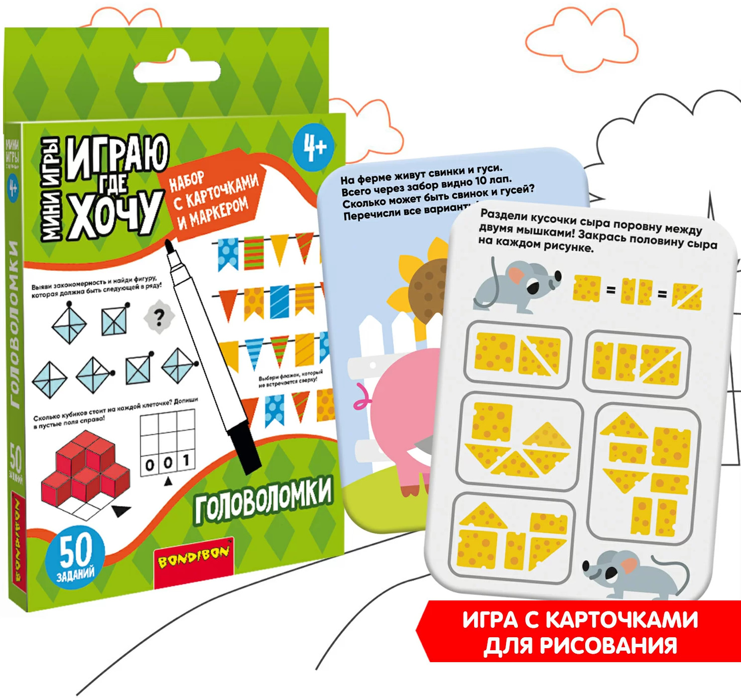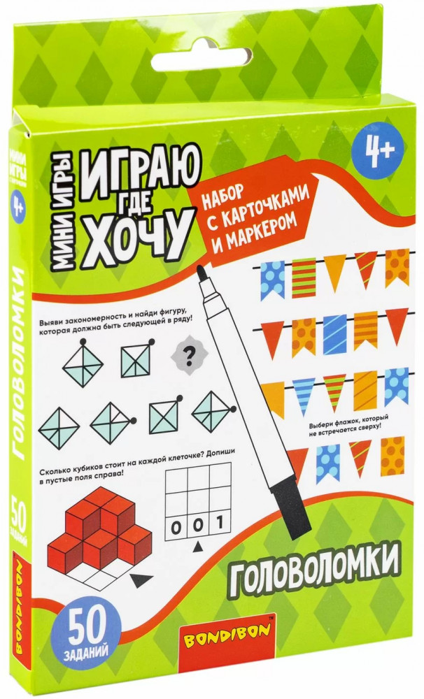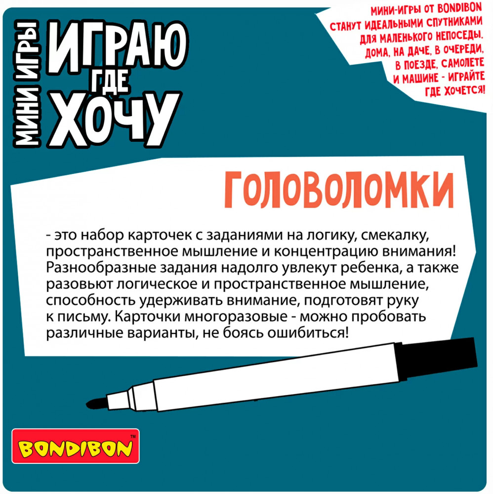 Набор многоразовых карт с заданиями на логику и смекалку — отличный помощник в подготовке детей к школе! Развивающая мини-игра с карточками и маркером «Головоломки» серии «Играю где хочу» от Bondibon дает возможность интересно и с пользой провести время дома, в дороге и даже в очереди! Перед Вами множество увлекательных заданий. Решайте логические задачки, выявляйте закономерности, подбирайте числа, дорисовывайте недостающие предметы и многое другое. Пробуйте различные варианты решения прямо на карточках и не бойтесь ошибиться. Маркер с легкостью стирается при помощи салфетки!