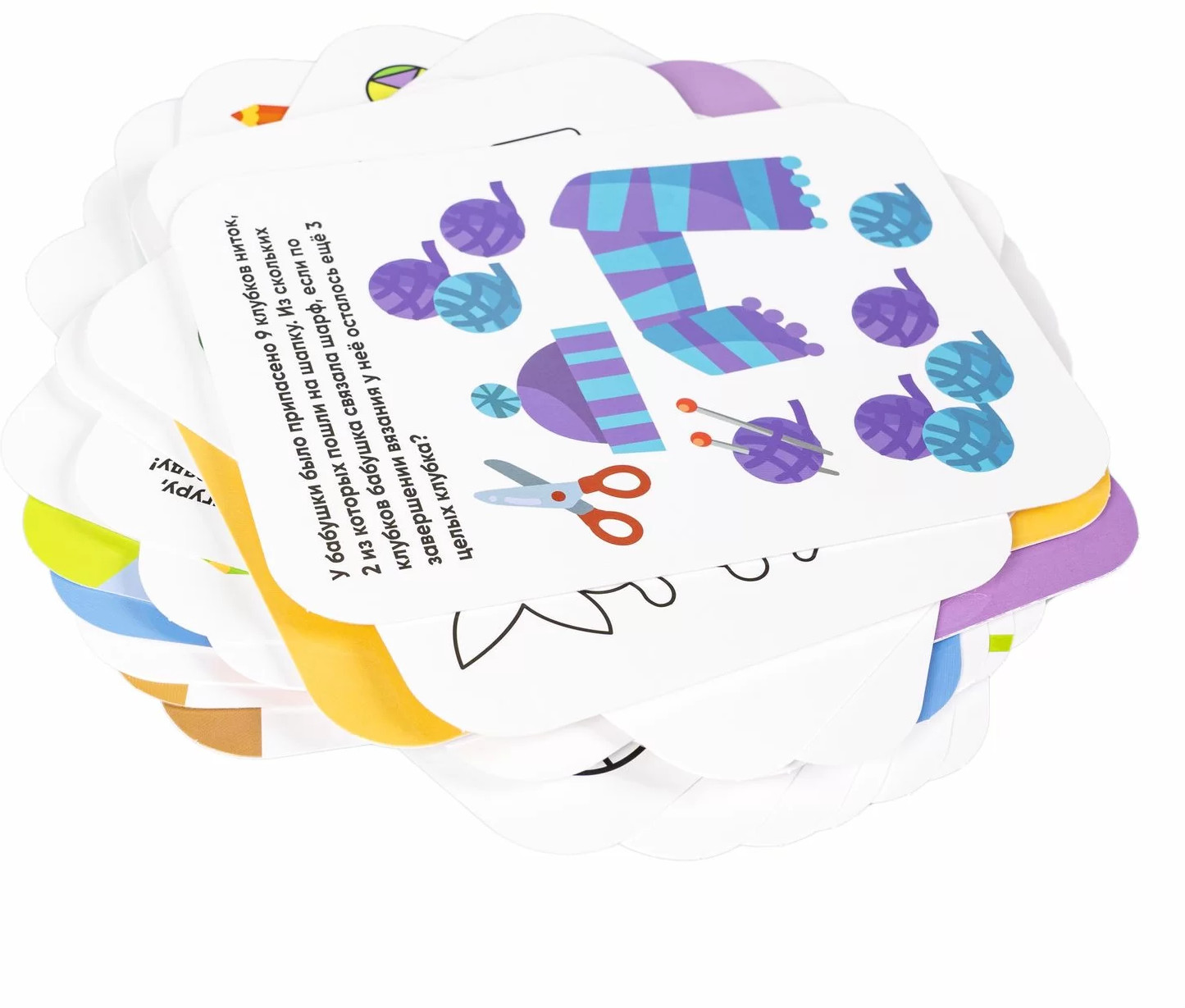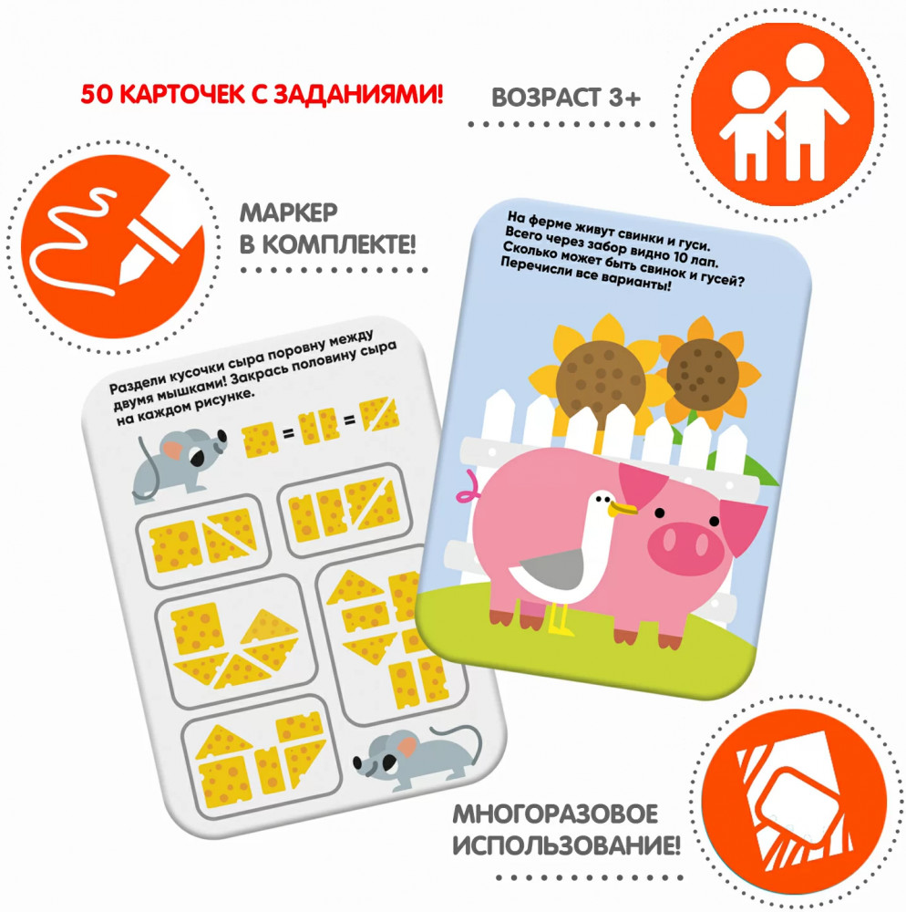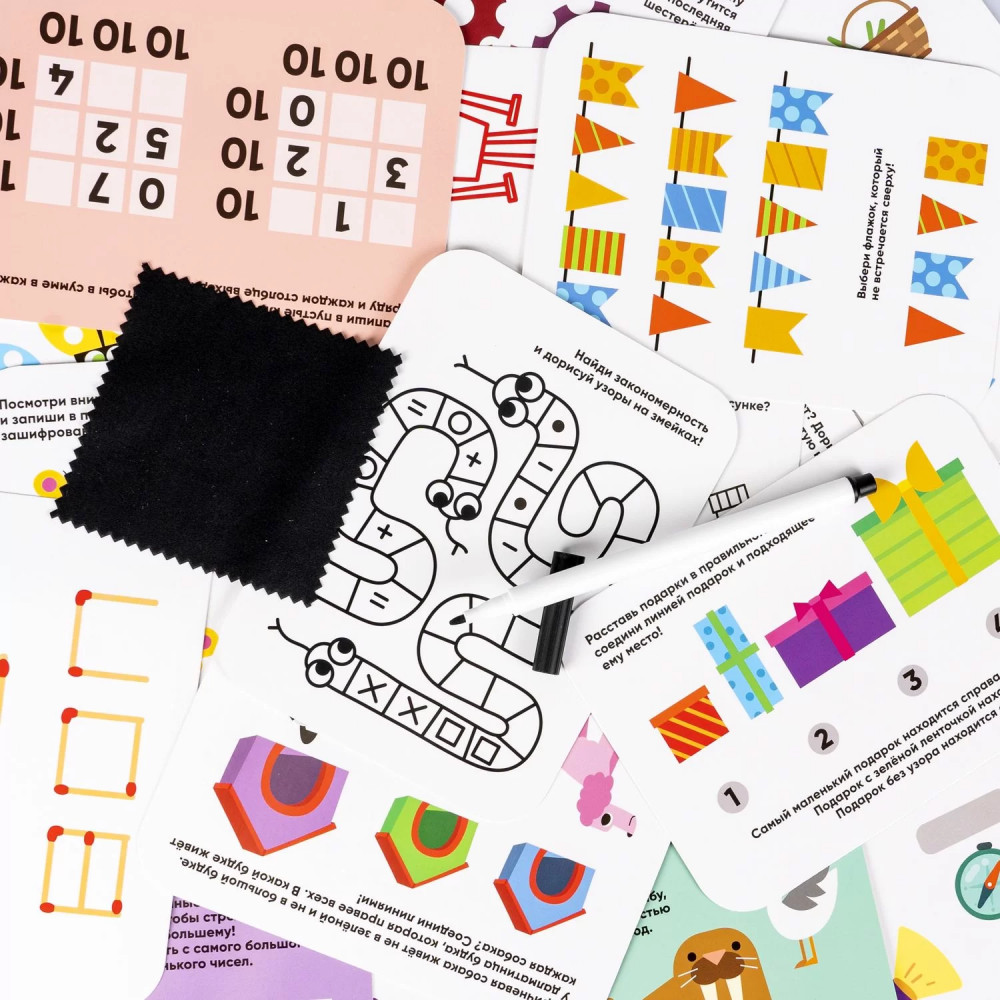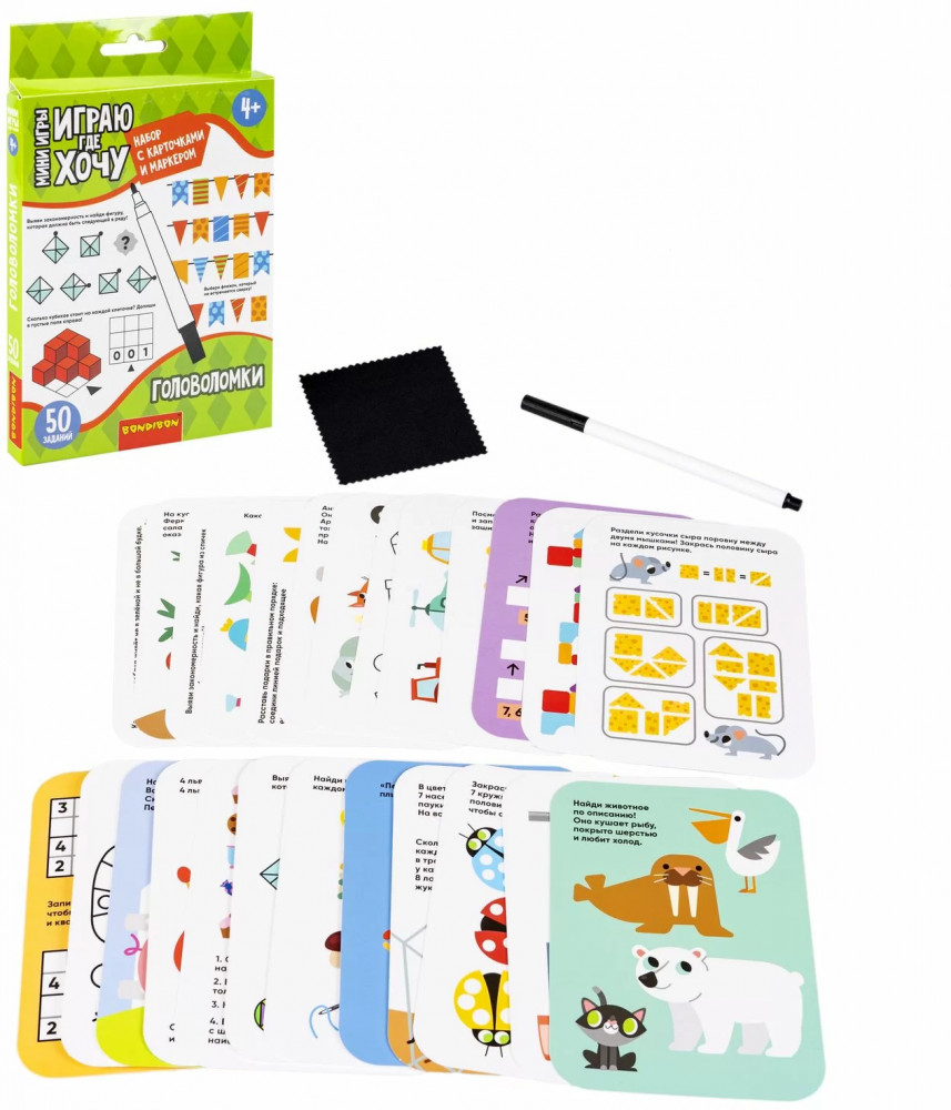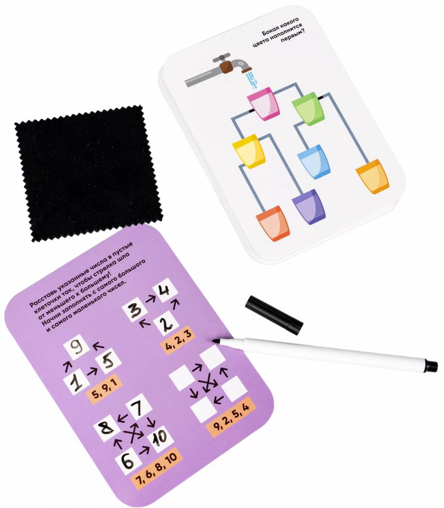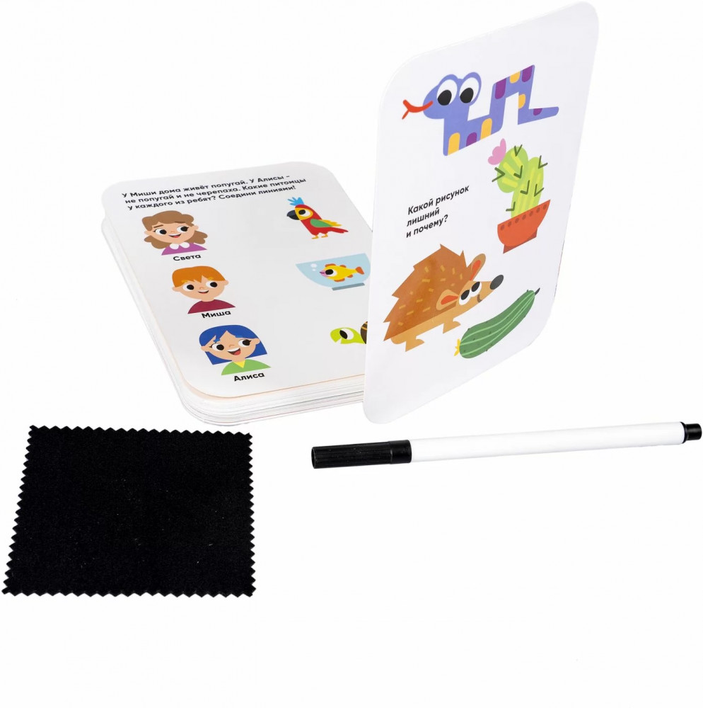 В набор входят: 50 заданий на ламинированных картах, маркер, салфетка.