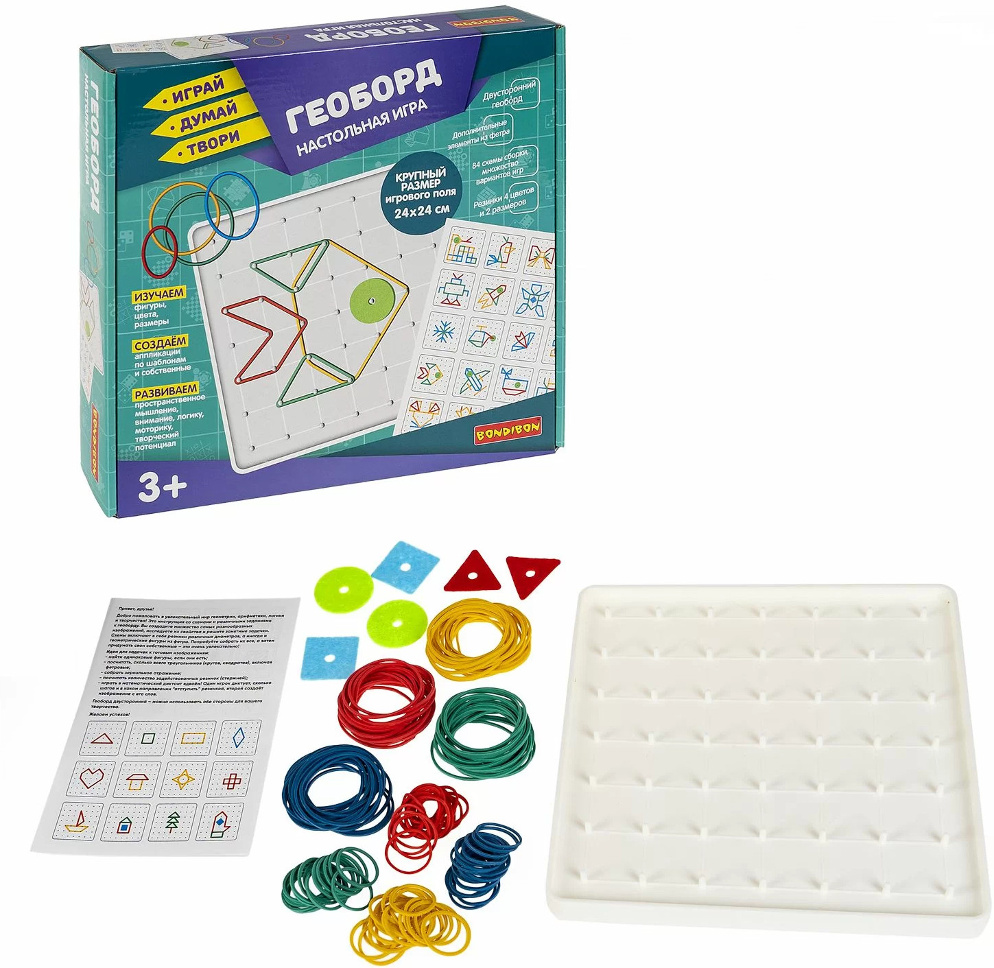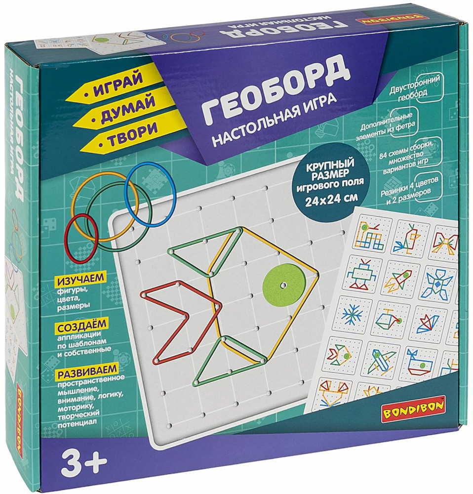 Создавайте разнообразные изображения и решайте занятные задачки! Настольная игра «Геоборд» содержит 84 схемы сборки и позволяет одновременно развивать творческие способности и логико-математическое мышление ребенка. Создавайте аппликации на доске, натягивая разноцветные резинки на колышки и используя детали в виде геометрических фигур. Попробуйте сначала собрать все изображения по схемам, а потом придумайте собственные. Выполните предложенные задания. Играя, дети познакомятся с простыми геометрическими фигурами, такими понятиями, как симметрия, вверх-вниз, вправо-влево. «Геоборд» от Бондибон поможет потренировать навыки счета, выучить основные цвета, развить внимание, фантазию, логическое и пространственное мышление. Размер игрового поля 24×24 см.