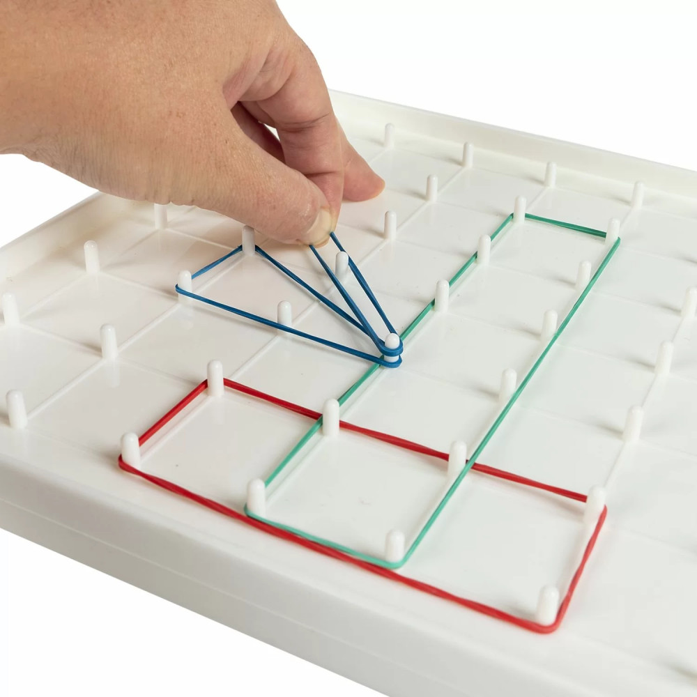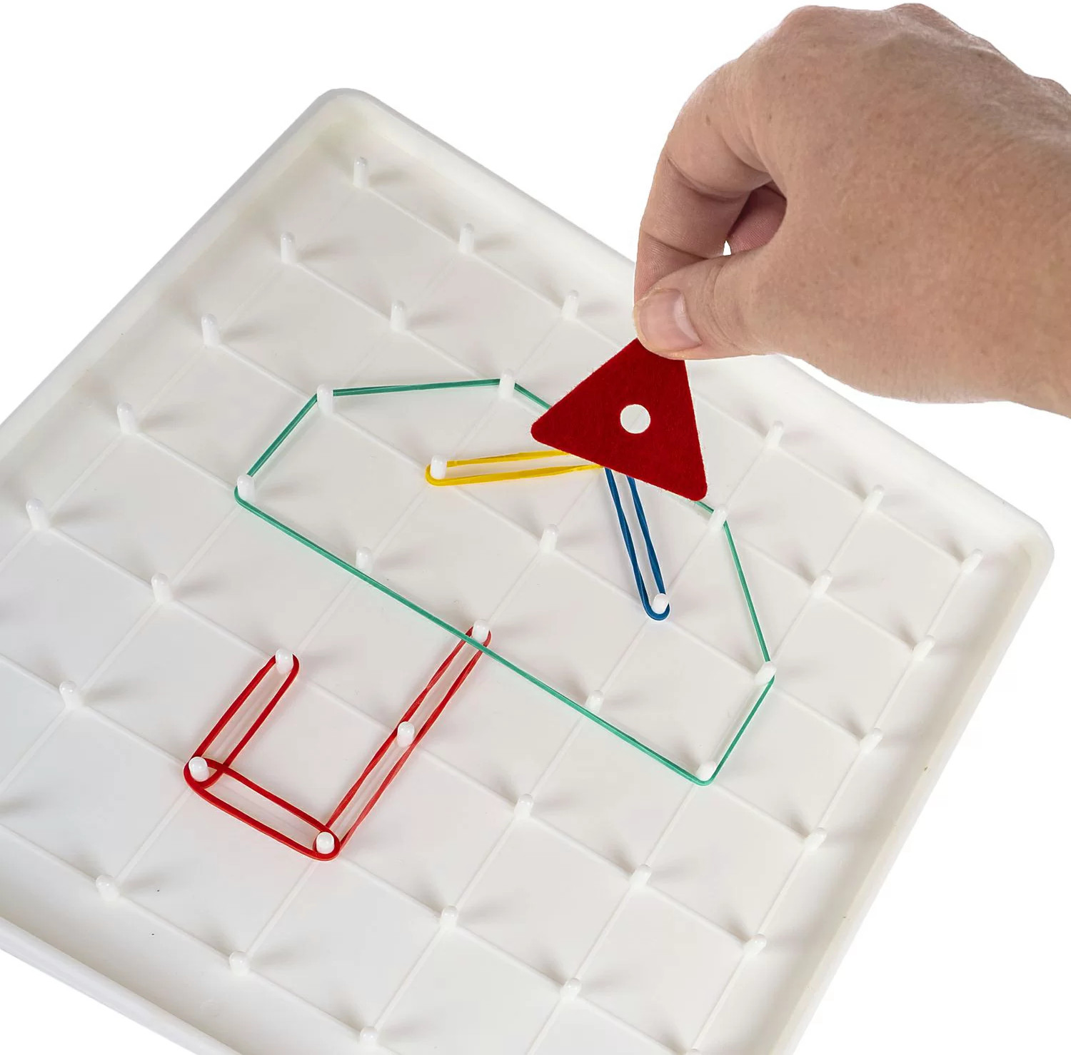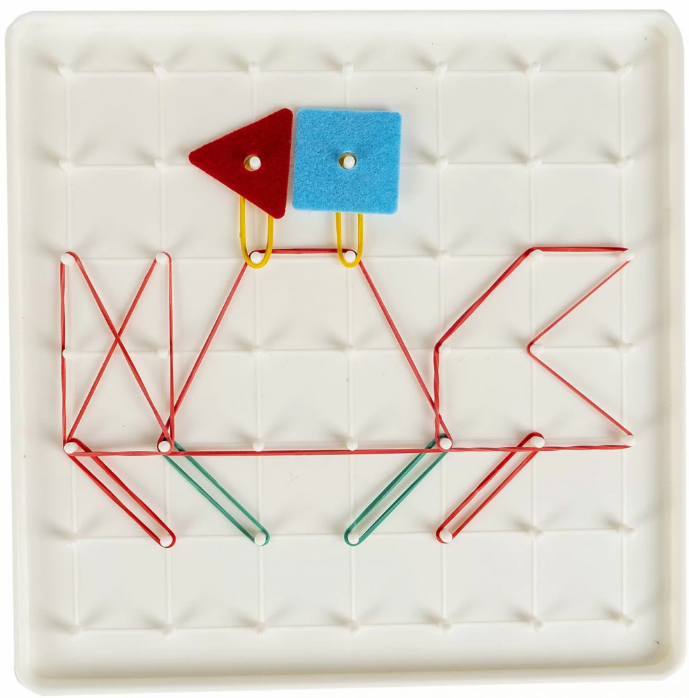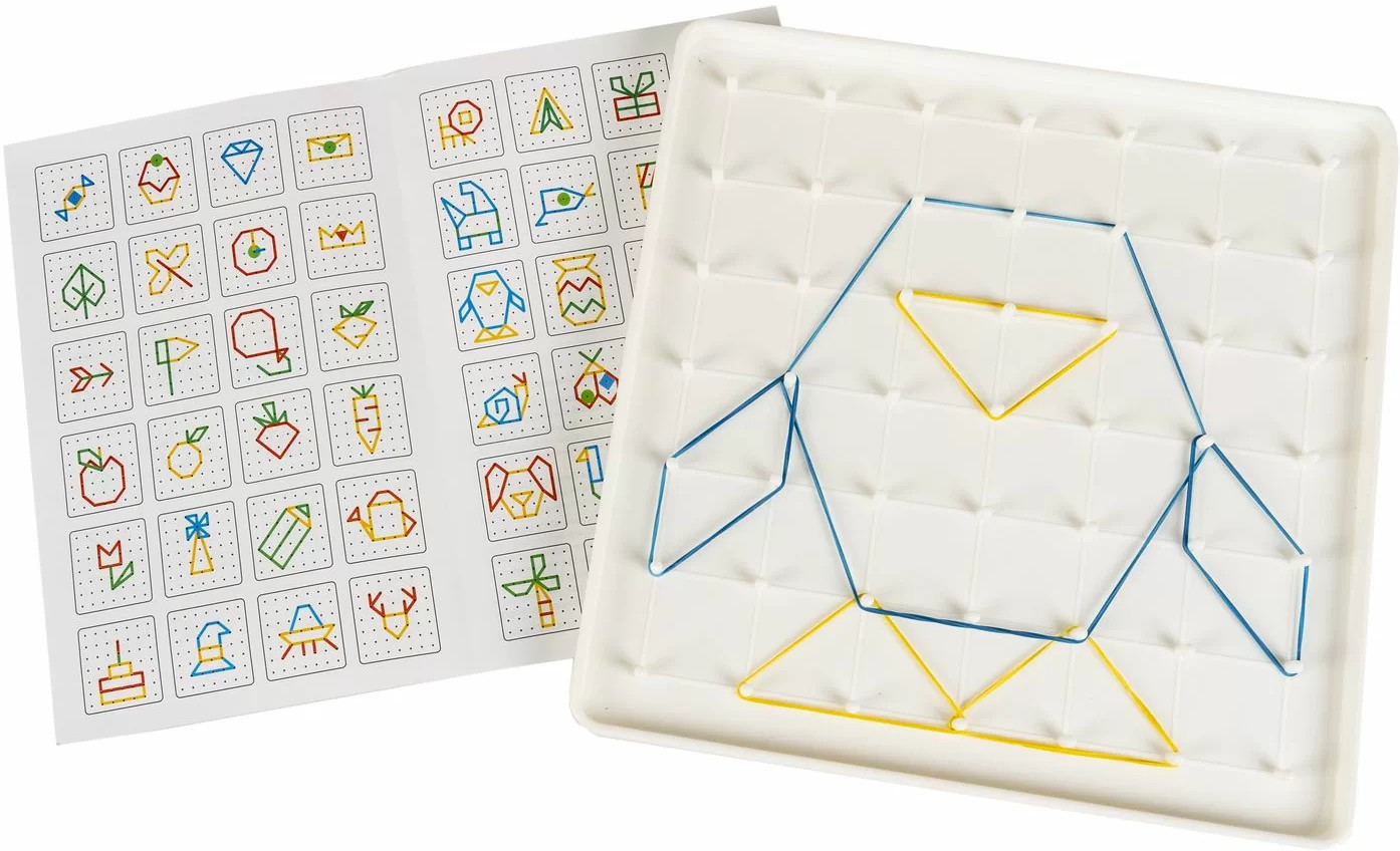 В набор входят: геоборд, 84 схемы сборки, резинки 2 размеров и 4 цветов (зеленый, синий, красный, желтый), дополнительные детали из фетра.