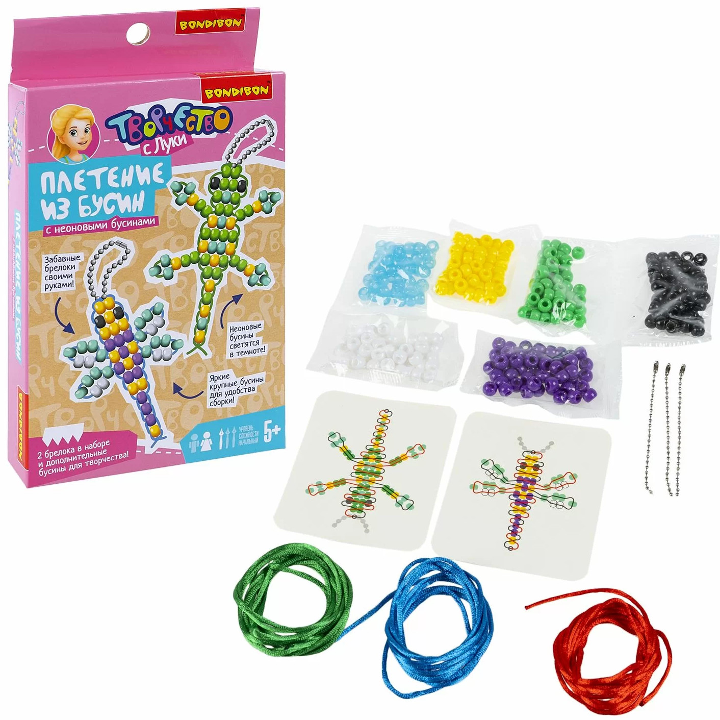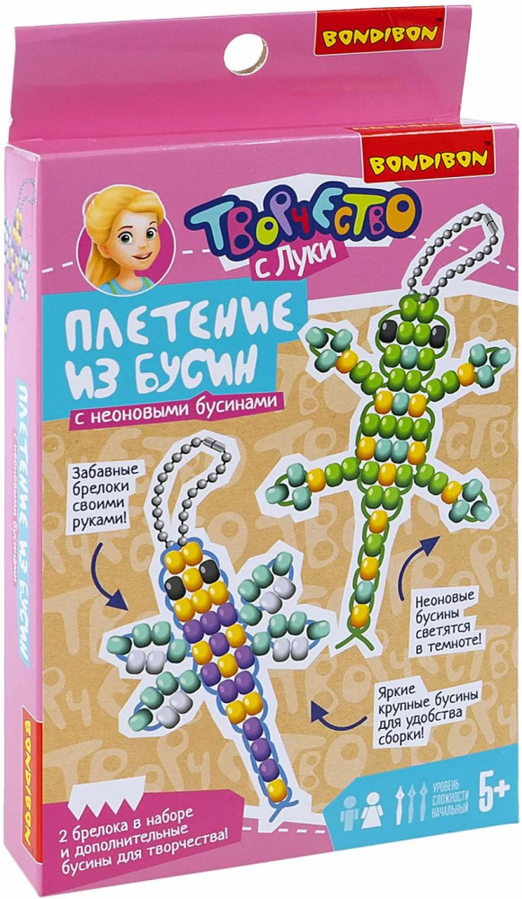 Сделай своими руками два забавных неоновых брелока в виде стрекозы и ящерицы! Набор для творчества плетение из бусин «Летний луг» содержит яркие крупные бусины и все необходимое для сборки очаровательных аксессуаров, а также дополнительные бусины для творчества! Данный набор для хобби займет ребенка на долгие часы и поможет развить фантазию, внимание, усидчивость, мелкую моторику. Набор для создания 2 неоновых брелоков плетение из бусин «Летний луг» серии Творчество с Луки от Бондибон — прекрасный подарок для детей, которые любят рукоделие и творчество.