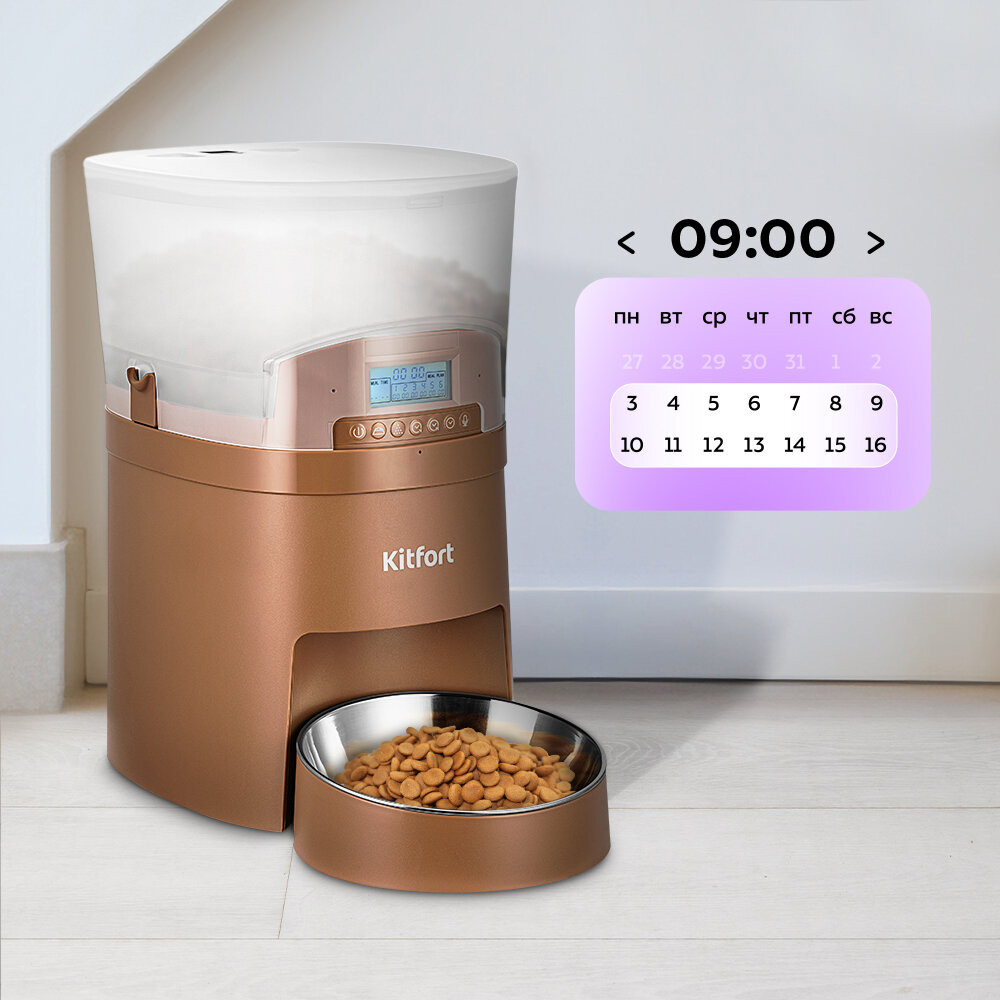 Умная кормушка для животных КТ-6366 позволяет соблюдать необходимый режим кормления домашнего питомца во время вашего отсутствия. Умная кормушка подходит для кошек или собак мелких и средних пород. У устройства есть функция записи голосовой команды. С помощью умной кормушки вы можете установить до 6 приёмов пищи в сутки, а также отрегулировать количество порций в каждом кормлении. Работа кормушки настраивается с помощью кнопок на панели управления. Вы можете с лёгкостью создать расписание кормления.