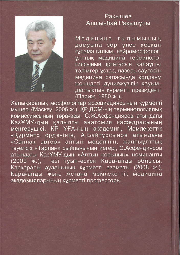 💳 Оплатить за товар можно при получении 🇰🇿 Есть бесплатная доставка по Казахстану от 1 дня 🎁 Копите бонусы с каждой покупки Төрт тілдегі (латын, қазақ, орыс, ағылшын) «Адам анатомиясындағы халықаралық атау-термендер» А. Рақышевтің 2003 жылы латынша-қазақща-орысша үш тілде жарық көрген «Международная анатомическая номенклатура» атты еңбегініің жаңаша толықтырылған түрі болып табылады. Содан бергі уақыт ішінде алғашқы басылымның кемшін тұстары жаңа талап тұрғысынан қайта қаралып, түзету жұмыстары жүргізілумен қатар көптеген жаңа атау-терминдер қосылды. |