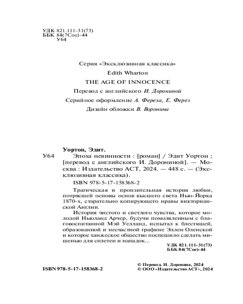 💳 Оплатить за товар можно при получении 🇰🇿 Есть бесплатная доставка по Казахстану от 1 дня 🎁 Копите бонусы с каждой покупки Серия: Эксклюзивная классика Трагическая и пронзительная история любви, потрясшей основы основ высшего света Нью-Йорка 1870-х, старательно копирующего нравы викторианской Англии. История чистого и светлого чувства, которое молодой Ньюланд Арчер, будучи помолвленным на благовоспитанной Мэй Уелланд, испытал к блестящей, образованной и несчастной графине Эллен Оленской и которое ханжеское общество поспешило сделать мишенью для сплетен и нападок... |