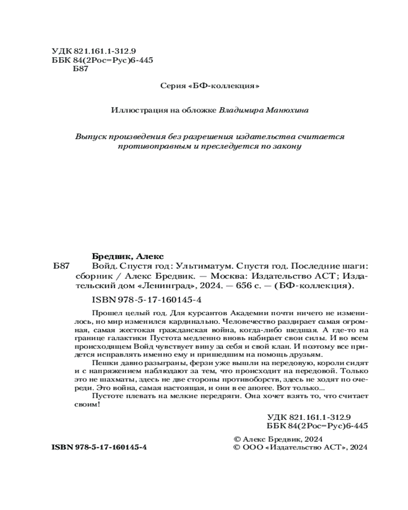 💳 Оплатить за товар можно при получении 🇰🇿 Есть бесплатная доставка по Казахстану от 1 дня 🎁 Копите бонусы с каждой покупки Серия: Коллекция Прошел целый год. Для курсантов Академии почти ничего не изменилось, но мир изменился кардинально. Человечество раздирает самая огромная, самая жестокая гражданская война, когда-либо шедшая. А где-то на границе галактики Пустота медленно вновь набирает свои силы. И во всем происходящем Войд чувствует вину за себя и свой клан. И поэтому все придется исправлять именно ему и пришедшим на помощь друзьям. Пешки давно разыграны, ферзи уже вышли на передовую, короли сидят и с напряжением наблюдают за тем, что происходит на передовой. Только это не шахматы, здесь не две стороны противоборств, здесь не ходят по очереди. Это война, самая настоящая, и они в ее апогее. Вот только... Пустоте плевать на мелкие передряги. Она хочет взять то, что считает своим! |