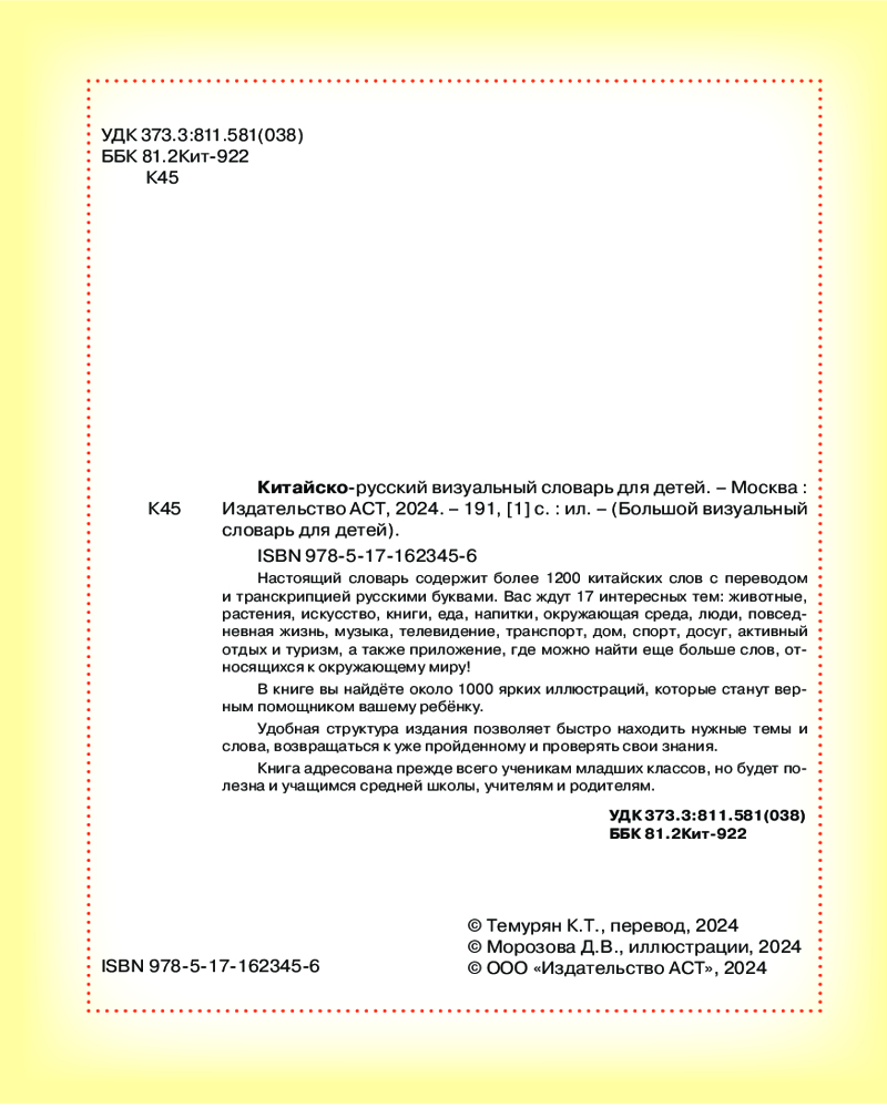💳 Оплатить за товар можно при получении 🇰🇿 Есть бесплатная доставка по Казахстану 🎁 Копите бонусы с каждой покупки Серия: Большой визуальный словарь для детей Настоящий словарь содержит более 1200 китайских слов с переводом и транскрипцией русскими буквами. Вас ждут 17 интересных тем: животные, растения, искусство, книги, еда, напитки, окружающая среда, люди, повседневная жизнь, музыка, телевидение, транспорт, дом, спорт, досуг, активный отдых и туризм, а также приложение, где можно найти еще больше слов, относящихся к окружающему миру! В книге вы найдёте около 1000 ярких иллюстраций, которые станут верным помощником вашему ребёнку. Удобная структура издания позволяет быстро находить нужные темы и слова, возвращаться к уже пройденному и проверять свои знания. Книга адресована прежде всего ученикам младших классов, но будет полезна и учащимся средней школы, учителям и родителям. |