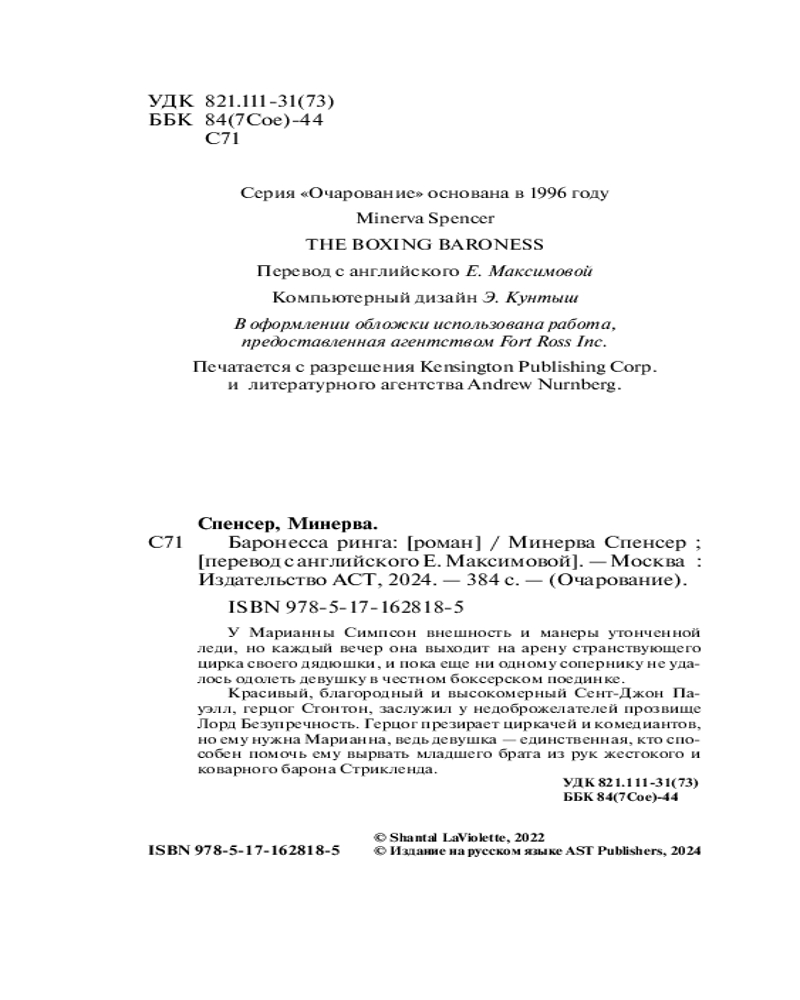 💳 Оплатить за товар можно при получении 🇰🇿 Есть бесплатная доставка по Казахстану от 1 дня 🎁 Копите бонусы с каждой покупки Серия: Очарование! У Марианны Симпсон внешность и манеры утонченной леди, но каждый вечер она выходит на арену странствующего цирка своего дядюшки, и пока еще ни одному сопернику не удалось одолеть девушку в честном боксерском поединке. Красивый, благородный и высокомерный Сент-Джон Пауэлл, герцог Стонтон, заслужил у недоброжелателей прозвище лорд Безупречность. Герцог презирает циркачей и комедиантов, но ему нужна Марианна, ведь девушка — единственная, кто способен помочь ему вырвать младшего брата из рук жестокого и коварного барона Стрикленда. |