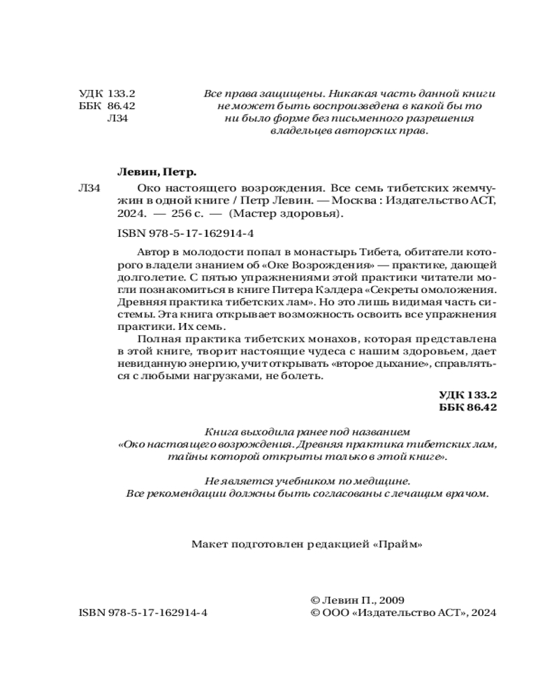 💳 Оплатить за товар можно при получении 🇰🇿 Есть бесплатная доставка по Казахстану от 1 дня 🎁 Копите бонусы с каждой покупки Серия: Мастер здоровья Петр Левин написал уникальное руководство по древней практике тибетских монахов, направленной на достижение долголетия и здоровья. Он раскрывает семь упражнений легендарного комплекса «Око Возрождения», которые помогут обрести энергию, силу и гармонию. |