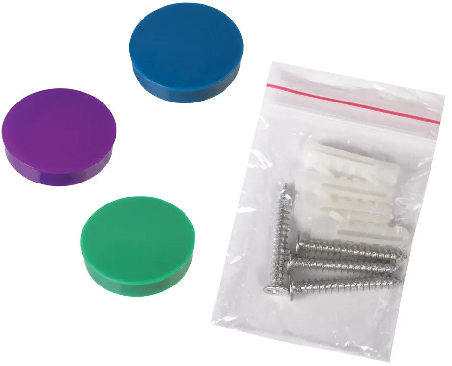 Рабочая поверхность белого цвета изготовлена из небьющегося стекла. Размер доски — 45 × 45 см. Надежно упакована в защитную пленку и красочную подарочную коробку с ручкой. 3 специальных неодимовых магнита и элементы крепления входят в комплект. Скрытый тип крепления с задней стороны поможет вписать доску в любой интерьер.