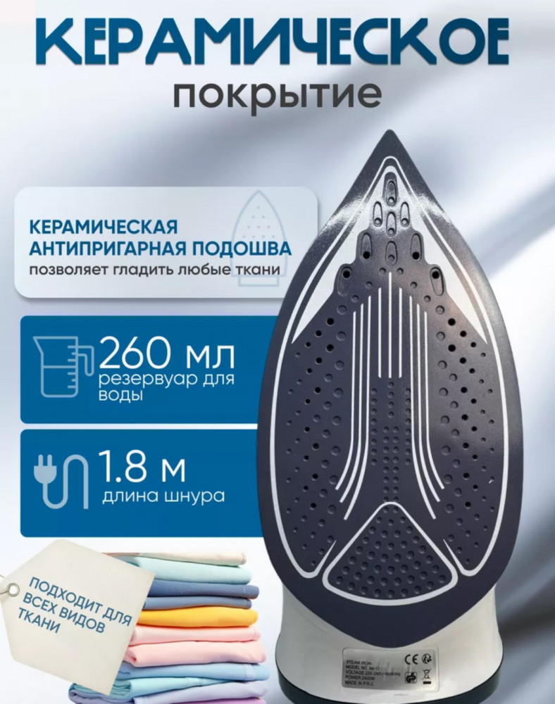 Мощный утюг Mivan Mi-12 создан для безупречной глажки и легкого ухода за одеждой. Удобное устройство для глажки белья с долговечной керамической антипригарной подошвой устойчиво к образованию коррозии. За счет качественного материала, подошва с керамическим покрытием легко и бережно скользит по ткани без следов и прилипания к одежде.
