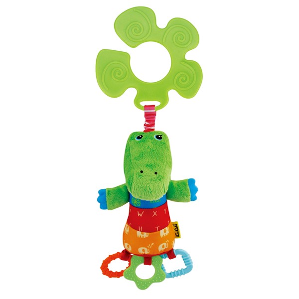 Яркий, красивый, мягкий крокодильчик с пищалкой внутри, очень приятный на ощупь, один минус - неудобное кольцо крепеж, большое, жесткое, ребенок им постоянно ударялся, пришлось срезать.