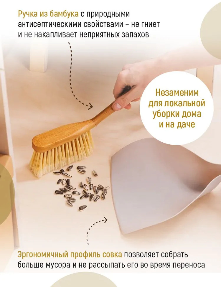 💳 Оплатить за товар можно при получении 🇰🇿 Есть бесплатная доставка по Казахстану от 1 дня 🎁 Копите бонусы с каждой покупки Комплект для уборки — совок и щетка-сметка с бамбуковой ручкой — незаменим в каждом доме. Экологичные материалы, современный дизайн и эффективность в использовании! Эргономичный профиль щетки обеспечивает комфорт ее использования. Бамбуковая ручка не впитывает влагу, не гниет и не накапливает неприятных запахов. Щетина на 100% изготовлена из вторично-переработанного пластика, совок — на 15%. Ручка щетки на 100% сделана из бамбука — натурального быстро возобновляемого сырья, обладающего природными антисептическими и антибактериальными свойствами. Щетка легко крепится к совку, это обеспечивает удобство хранения. Комплект отлично подходит для локальной уборки в квартире или офисе, для сметания песка и листьев с садовой мебели, в столярной мастерской, для уборки за домашними животными. |