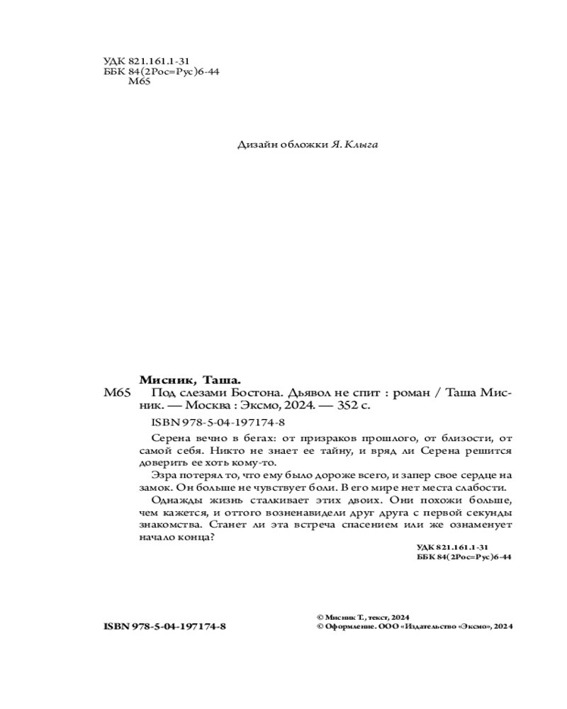 Под слезами Бостона. Дьявол не спитобложка качество сюжет В данный момент этот товар отсутствует в продаже. Возможно, у нас найдется аналогичный или похожий товар здесь. Серия: Под слезами Бостона. Бестселлеры Таши Мисник (обложка с клапанами) Серена вечно в бегах: от призраков прошлого, от близости, от самой себя. Никто не знает ее тайну, и вряд ли Серена решится доверить ее хоть кому-то. Эзра потерял то, что ему было дороже всего, и запер свое сердце на замок. Он больше не чувствует боли. В его мире нет места слабости. Однажды жизнь сталкивает этих двоих. Они похожи больше, чем кажется, и оттого возненавидели друг друга с первой секунды знакомства. Станет ли эта встреча спасением или же ознаменует начало конца? |