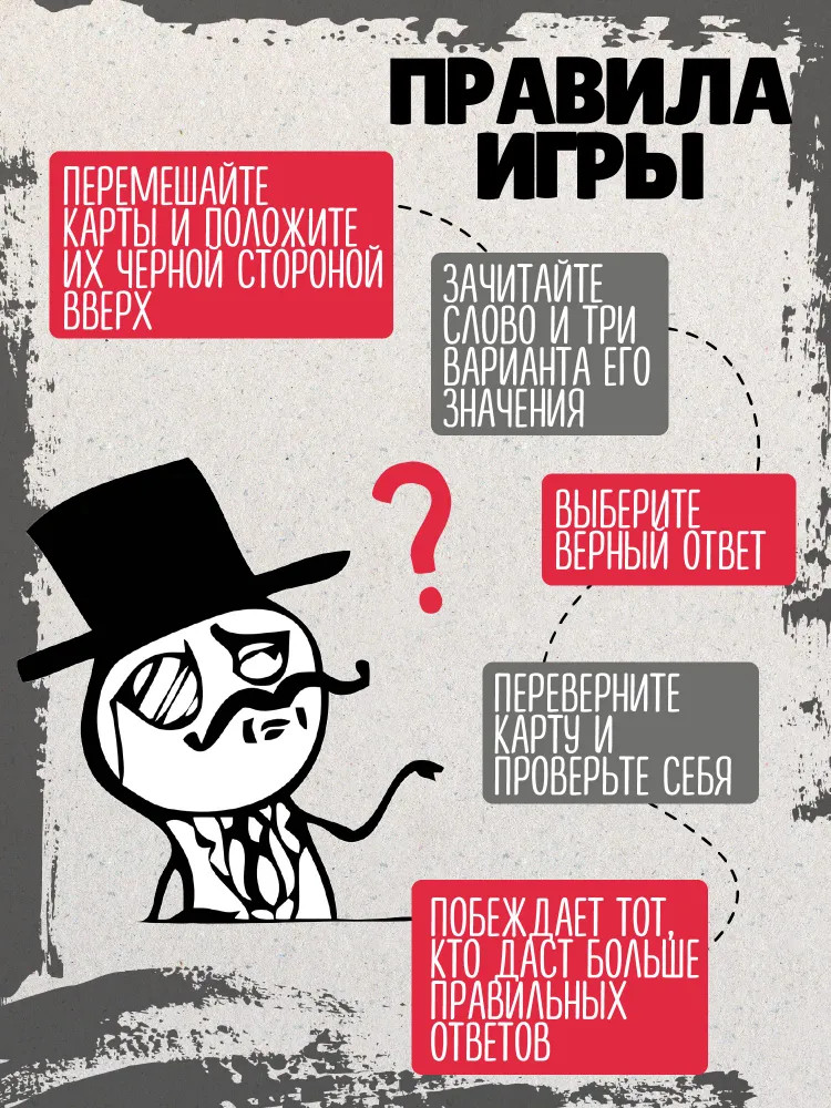 💳 Оплатить за товар можно при получении 🇰🇿 Есть бесплатная доставка по Казахстану от 1 дня 🎁 Копите бонусы с каждой покупки Настольная игра для большой компании сумбурный квиз «Знаток слов» — это интеллектуально-развлекательная игра, в которой игроки могут проверить эрудицию и отгадать правильное значение разных слов. Настольная игра для большой компании сумбурный квиз «Знаток слов» способствует развитию эрудиции, логического мышления и сообразительности. |