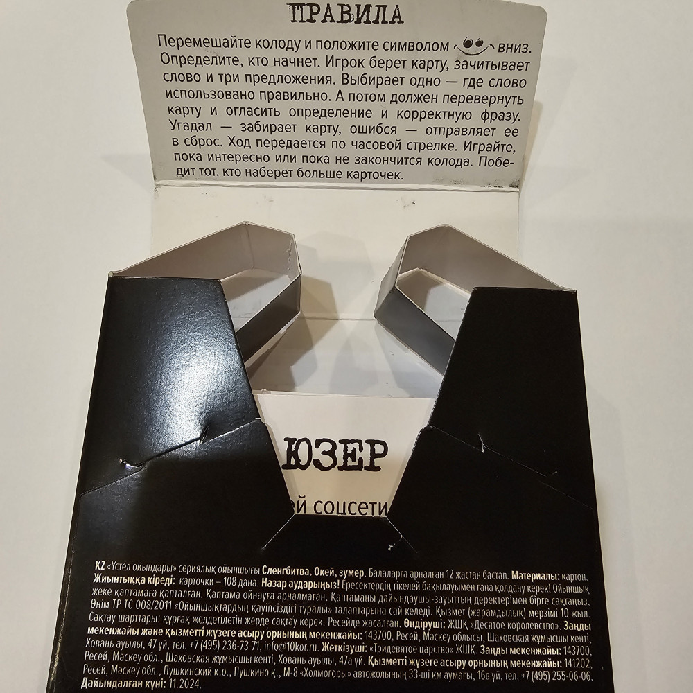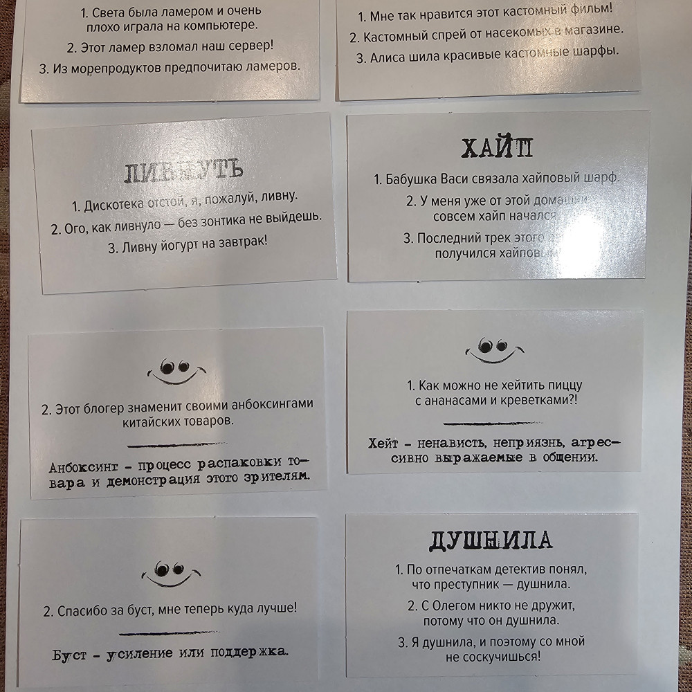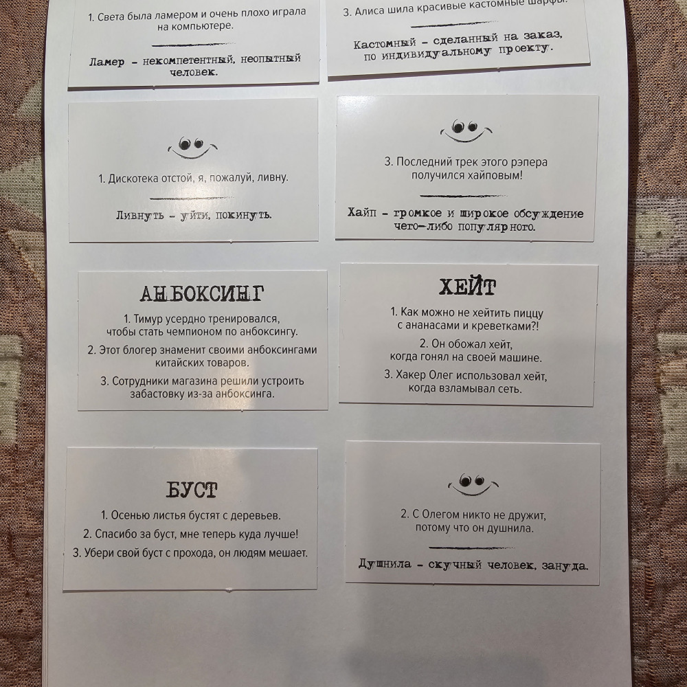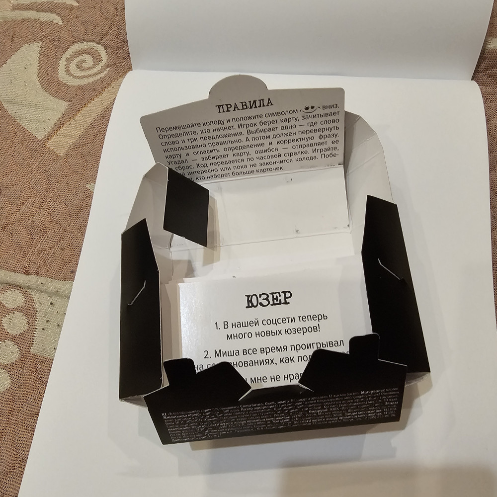 Очень классная игра, слова, которые употребляют подростки, но не знает старшее поколение. Карточки сделаны из ламинированного картона, шрифт жирный, все чётко видно. С одной стороны слово и варианты его употребления, с другой стороны, правильный ответ и значение слова. Есть только один минусик, при каждом открытии, коробочка разбирается до конца, и чтобы сложить карточки обратно, нужно сначала собрать коробочку.