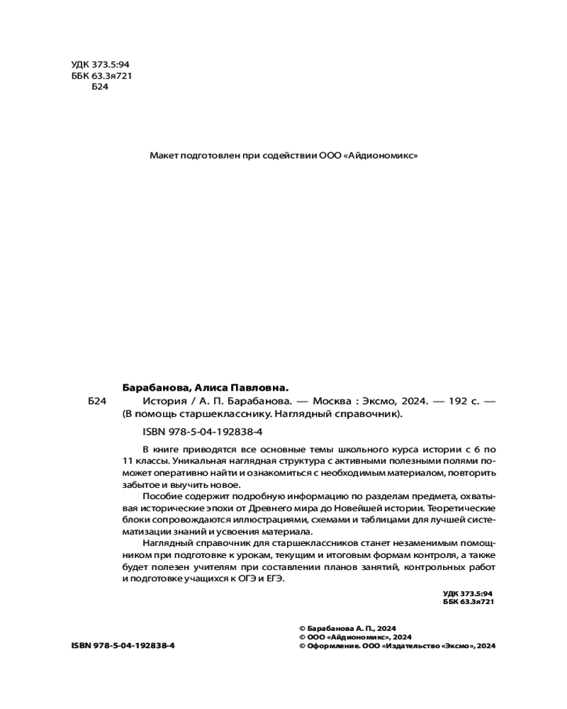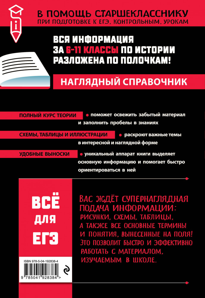 💳 Оплатить за товар можно при получении 🇰🇿 Есть бесплатная доставка по Казахстану от 1 дня 🎁 Копите бонусы с каждой покупки Серия: В помощь старшекласснику. Наглядный справочник Вы готовитесь к экзаменам, перегружены информацией и не знаете, на что обратить внимание, когда каждая мелочь кажется важной? Вам поможет уникальная книга для школьников с наглядной структурой и активными полями! Она представит материал школьного курса истории за 6-11 классы в доступном изложении, а особый макет издания выделит главное и структурирует информацию для наилучшего запоминания. Активные поля обеспечат быстрый и точный поиск информации, сохраняя ваше время и увеличивая продуктивность. В справочнике вы найдете сведения по разделам предмета, охватывая исторические эпохи от Древнего мира до Новейшей Истории. Теоретические блоки сопровождаются иллюстрациями, схемами и таблицами для комплексной подготовки к ЕГЭ по истории. Пособие создано для старшеклассников, которые ценят качество, удобство, а также эффективность в ходе учебного процесса. Помимо этого, оно будет полезно и абитуриентам при поступлении в вузы, и учителям при проведении занятий и экзаменов. |