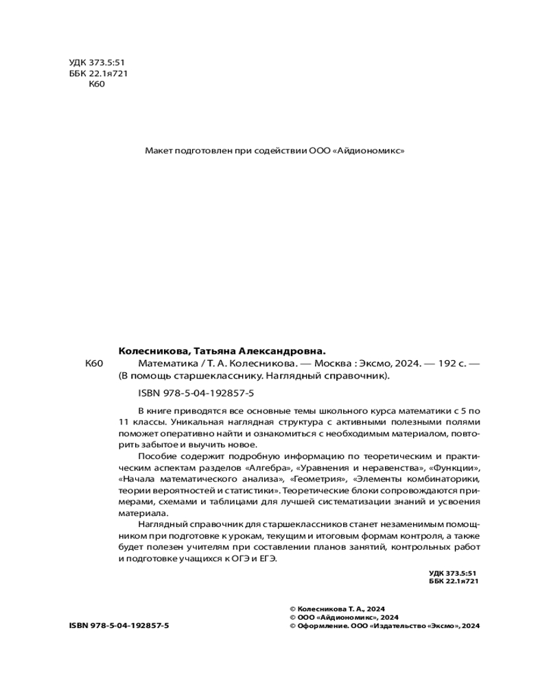 💳 Оплатить за товар можно при получении 🇰🇿 Есть бесплатная доставка по Казахстану от 1 дня 🎁 Копите бонусы с каждой покупки Серия: В помощь старшекласснику. Наглядный справочник Вы готовитесь к экзаменам, перегружены информацией и не знаете, на что обратить внимание, когда каждая мелочь кажется важной? Вам поможет уникальная книга для школьников с наглядной структурой и активными полями! Она представит материал школьного курса математики за 5-11 классы в доступном изложении, а особый макет издания выделит главное и структурирует информацию для наилучшего запоминания. Активные поля обеспечат быстрый и точный поиск информации, сохраняя ваше время и увеличивая продуктивность. В справочнике вы найдете важные сведения по разделам «Алгебра», «Уравнения и неравенства», «Функции», «Начала математического анализа», «Геометрия», «Элементы комбинаторики, теории вероятностей и статистики». Теоретические блоки сопровождаются примерами, схемами и таблицами для комплексной подготовки к ЕГЭ по математике. Пособие создано для старшеклассников, которые ценят качество, удобство, а также эффективность в ходе учебного процесса. Помимо этого, оно будет полезно и абитуриентам при поступлении в вузы, и учителям при проведении занятий и экзаменов. |