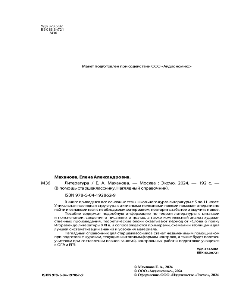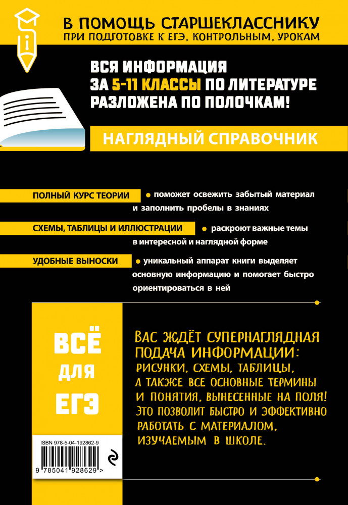 ЛитератураВ данный момент этот товар отсутствует в продаже. Возможно, у нас найдется аналогичный или похожий товар здесь. Серия: В помощь старшекласснику. Наглядный справочник Вы готовитесь к экзаменам, перегружены информацией и не знаете, на что обратить внимание, когда каждая мелочь кажется важной? Вам поможет уникальная книга для школьников с наглядной структурой и активными полями! Она представит материал школьного курса литературы за 5-11 классы в доступном изложении, а особый макет издания выделит главное и структурирует информацию для наилучшего запоминания. Активные поля обеспечат быстрый и точный поиск информации, сохраняя ваше время и увеличивая продуктивность. В справочнике вы найдете сведения по теории литературы с цитатами и пояснениями, справки о писателях и поэтах, а также комплексный анализ художественных произведений. Теоретические блоки охватывают период от «Слова о полку Игореве» до литературы ХХI в. и сопровождаются примерами, схемами и таблицами для комплексной подготовки к ЕГЭ по литературе. Пособие создано для старшеклассников, которые ценят качество, удобство, а также эффективность в ходе учебного процесса. Помимо этого, оно будет полезно и абитуриентам при поступлении в вузы, и учителям при проведении занятий и экзаменов. |