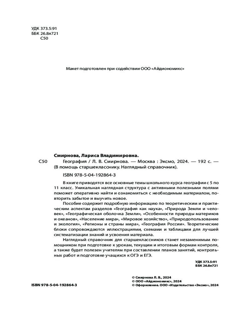 💳 Оплатить за товар можно при получении 🇰🇿 Есть бесплатная доставка по Казахстану от 1 дня 🎁 Копите бонусы с каждой покупки Серия: В помощь старшекласснику. Наглядный справочник Вы готовитесь к экзаменам, перегружены информацией и не знаете, на что обратить внимание, когда каждая мелочь кажется важной? Вам поможет уникальная книга для школьников с наглядной структурой и активными полями! Она представит материал школьного курса географии за 5-11 классы в доступном изложении, а особый макет издания выделит главное и структурирует информацию для наилучшего запоминания. Активные поля обеспечат быстрый и точный поиск информации, сохраняя ваше время и увеличивая продуктивность. В справочнике вы найдете важные сведения по разделам «География как наука», «Природа Земли и человек», «Географическая оболочка Земли», «Особенности природы материков и океанов», «Население мира», «Мировое хозяйство», «Природопользование и экология», «Регионы и страны мира», «География России». Теоретические блоки сопровождаются иллюстрациями, схемами и таблицами для комплексной подготовки к ЕГЭ по географии. Пособие создано для старшеклассников, которые ценят качество, удобство, а также эффективность в ходе учебного процесса. Помимо этого, оно будет полезно и абитуриентам при поступлении в вузы, и учителям при проведении занятий и экзаменов. |
