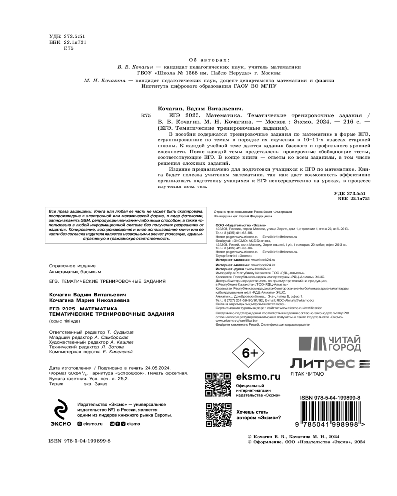 💳 Оплатить за товар можно при получении 🇰🇿 Есть бесплатная доставка по Казахстану от 1 дня 🎁 Копите бонусы с каждой покупки Серия: ЕГЭ. Тематические тренировочные задания (обложка) Книга содержит тренировочные задания по математике в форме ЕГЭ, сгруппированные по темам в порядке их изучения в 10-11 классах старшей школы. К каждой учебной теме даются задания базового и профильного уровней сложности. После каждой темы представлены проверочные обобщающие тесты, соответствующие ЕГЭ. В конце книги — ответы ко всем заданиям, в том числе решения сложных заданий. Издание адресовано учащимся старших классов. Книга будет полезна учителям математики, так как дает возможность эффективно организовать подготовку учащихся к ЕГЭ непосредственно на уроках, в процессе изучения всех тем. Сборник содержит задания, максимально приближенные к реальным, используемым на ЕГЭ, но распределенные по темам. Работая с книгой, можно последовательно отработать каждую тему, устранить пробелы в знаниях, а также систематизировать изучаемый материал. |