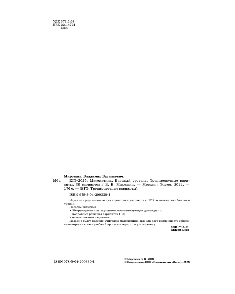 ЕГЭ-2025. Математика. Базовый уровень. Тренировочные варианты. 30 вариантовВ данный момент этот товар отсутствует в продаже. Возможно, у нас найдется аналогичный или похожий товар здесь. Серия: ЕГЭ. Тренировочные варианты (обложка) Издание адресовано учащимся старших классов и направлено на подготовку к ЕГЭ по математике базового уровня. Пособие содержит 30 тренировочных вариантов, составленных с учетом требований ЕГЭ, и ответы ко всем заданиям. Каждый вариант включает задания разных типов и уровней сложности. С помощью данной книги для школьников учащиеся смогут ознакомиться с тестом, выполнить его с учетом реального времени и оценить свой уровень готовности к ЕГЭ, а учителя — эффективно организовать учебный процесс и подготовку к экзамену. |