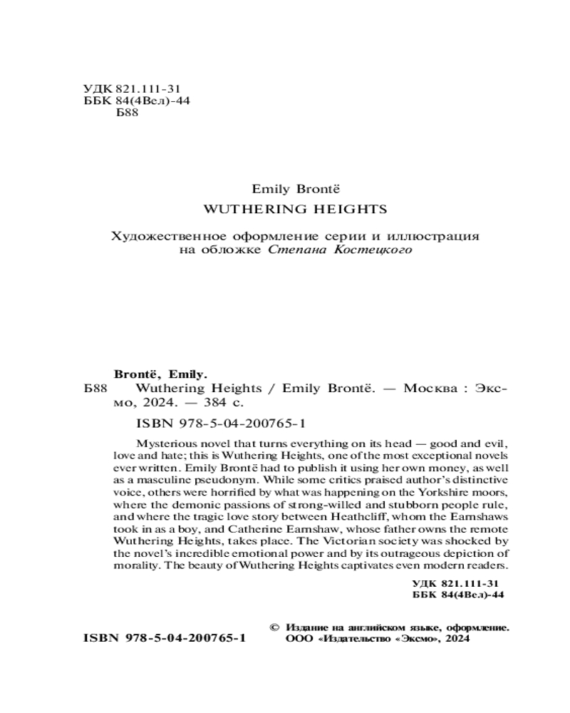 💳 Оплатить за товар можно при получении 🇰🇿 Есть бесплатная доставка по Казахстану от 1 дня 🎁 Копите бонусы с каждой покупки Серия: Магистраль. Original Роман-загадка, опрокидывающий все привычные представления о добре и зле, любви и ненависти — «Грозовой перевал», одно из самых уникальных произведений мировой литературы. Эмили Бронте была вынуждена опубликовать его за свой счет и под мужским псевдонимом. Пока одни рецензенты восхищались оригинальностью автора, другие пришли в ужас от того, что происходит на вересковых пустошах Йоркшира, где бушуют демонические страсти сильных личностей, не желающих идти на уступки друг другу, разворачивается история роковой любви Хитклифа, приемного сына владельца отдаленного поместья, к Кэтрин, дочери своего хозяина. Общество того времени было поражено необычайной эмоциональной силой романа и потрясено смелостью моральных концепций. «Грозовой перевал» завораживает своей красотой даже современного читателя. |