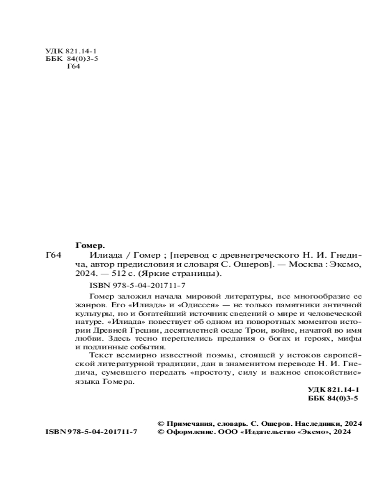 💳 Оплатить за товар можно при получении 🇰🇿 Есть бесплатная доставка по Казахстану от 1 дня 🎁 Копите бонусы с каждой покупки Серия: Яркие страницы Гомер заложил начало мировой литературы, все многообразие ее жанров. Его «Илиада» и «Одиссея» — не только памятники античной культуры, но и богатейший источник сведений о мире и человеческой натуре. «Илиада» повествует об одном из поворотных моментов истории Древней Греции — десятилетней осаде Трои, войне, начатой во имя любви. Здесь тесно переплелись предания о богах и героях, мифы и подлинные события. |
