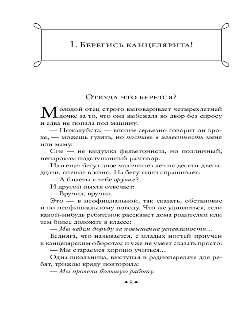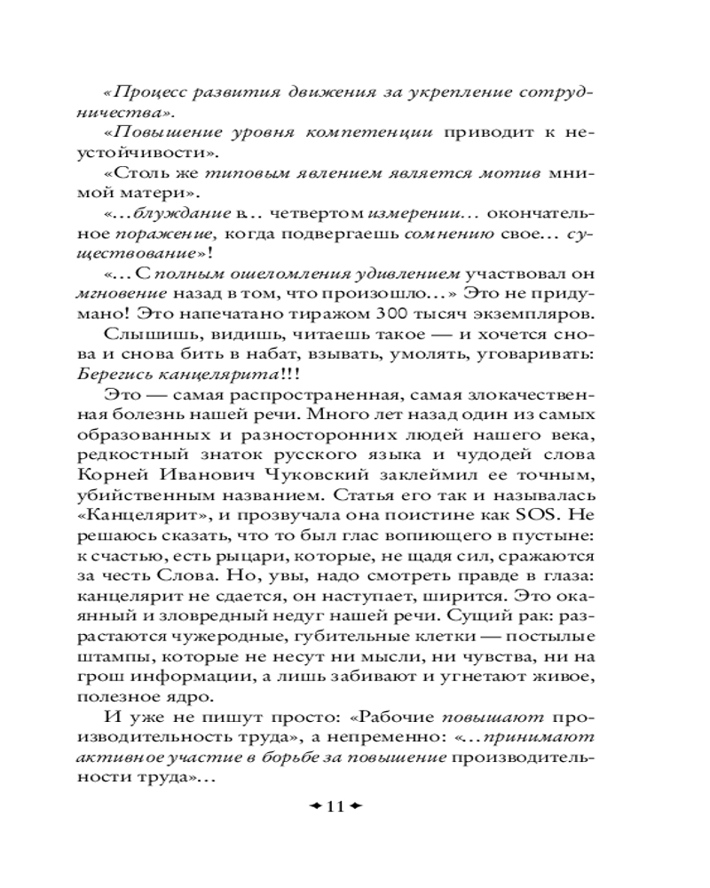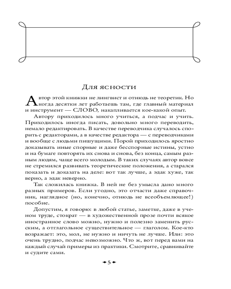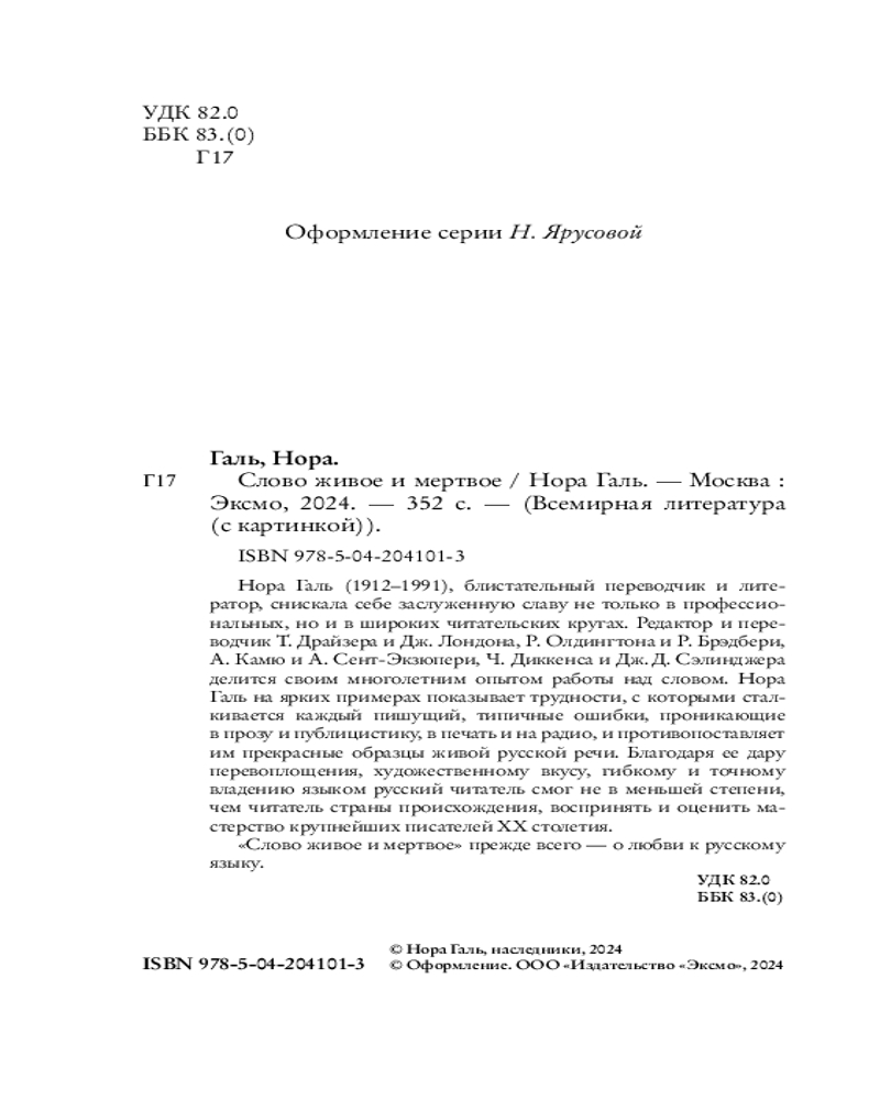Серия: Всемирная литература (новое оформление) Нора Галь (1912-1991), блистательный переводчик и литератор, снискала себе заслуженную славу не только в профессиональных, но и в широких читательских кругах. Редактор и переводчик Т. Драйзера и Дж. Лондона, Р. Олдингтона и Р. Брэдбери, А. Камю и А. Сент-Экзюпери, Ч. Диккенса и Дж. Д. Сэлинджера делится своим многолетним опытом работы над словом. Нора Галь на ярких примерах показывает трудности, с которыми сталкивается каждый пишущий, типичные ошибки, проникающие в прозу и публицистику, в печать и на радио, и противопоставляет им прекрасные образцы живой русской речи. Благодаря ее дару перевоплощения, художественному вкусу, гибкому и точному владению языком русский читатель смог не в меньшей степени, чем читатель страны происхождения, воспринять и оценить мастерство крупнейших писателей ХХ столетия. |