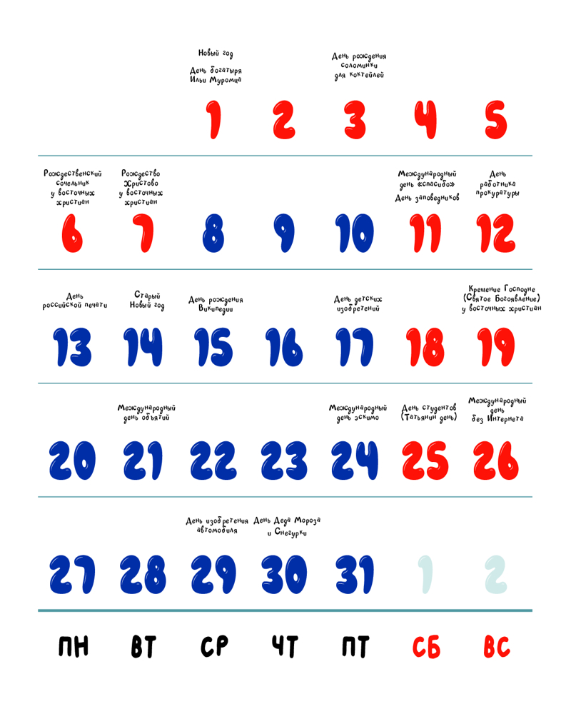Этот календарь — чудесный подарок близкому человеку или себе любимой! Яркие иллюстрации не только украсят интерьер, но и поднимут настроение в самый хмурый день. А большие окошки с числами вместят любые ваши отметки и не дадут вам забыть о важной дате или пропустить праздничный день.