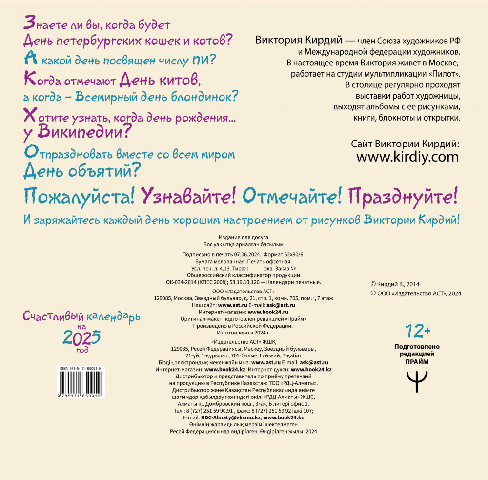А еще в этом году будет много-много больших и маленьких праздников, да таких, о которых вы и не догадываетесь! Знаете ли вы, когда будет День петербургских кошек и котов? А какой день посвящен числу пи? Когда отмечают День китов, а когда — Всемирный день блондинок? Хотите узнать, когда день рождения... у Википедии? Отпраздновать вместе со всем миром День объятий? Пожалуйста! Узнавайте! Отмечайте! Празднуйте! И заряжайтесь каждый день хорошим настроением от рисунков Виктории Кирдий! Большой квадратный настенный календарь, 12 разворотов. Мелованная бумага, яркие иллюстрации на каждом развороте. Новые иллюстрации!