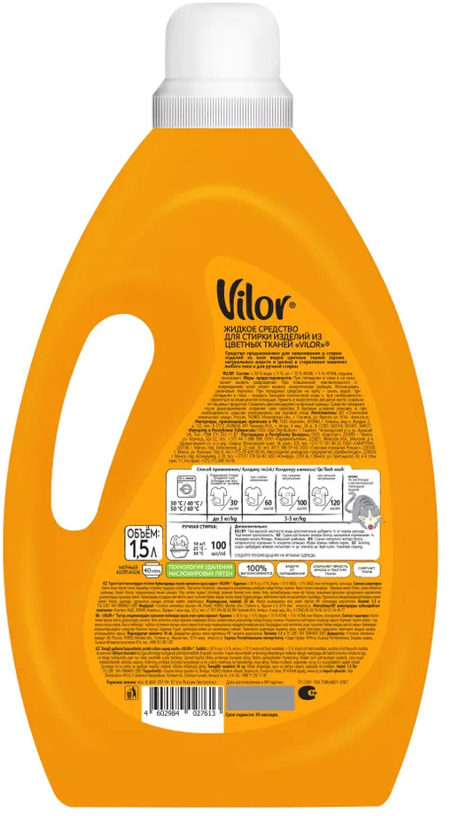 Универсальный гель для стирки белья идеально подходит для эффективной и бережной стирки цветных тканей. Благодаря инновационной формуле и жидкой текстуре, это средство обладает не только очищающими свойствами, но и выполняет функцию смягчения, ароматизации и защиты тканей, обеспечивает полностью безупречный результат, не оставляя следов или разводов на вашей одежде. Вилор является универсальным решением, как для ручной стирки, так и для автоматических стиральных машин (автомат) в воде любой жесткости. Этот уникальный чудо продукт обладает высокой эффективностью и легко справляется с отстирыванием белья (кроме шерсти и шелка). Формула разработана таким образом, чтобы сохранять яркость и насыщенность цвета вашей одежды, 100% выполаскивается из волокон ткани. Он содержит специальные компоненты, которые защищают ткани от загрязнений и сохраняют их красоту и свежесть. Жидкий порошок обеспечивает мягкое и бережное отношение к волокнам, сохраняя структуру и форму и предотвращая их износ и появления катышек, обладает современной технологией удаления масло-жировых пятен.